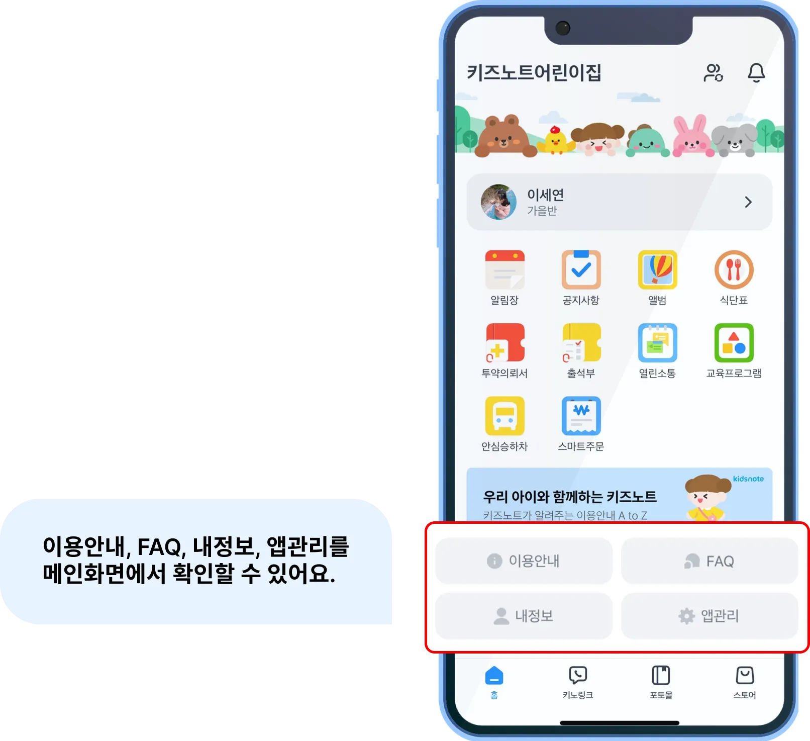 키즈노트 사용방법, 자주묻는질문 등 필요한 정보를 보다 빠르게 확인할 수 있어요.