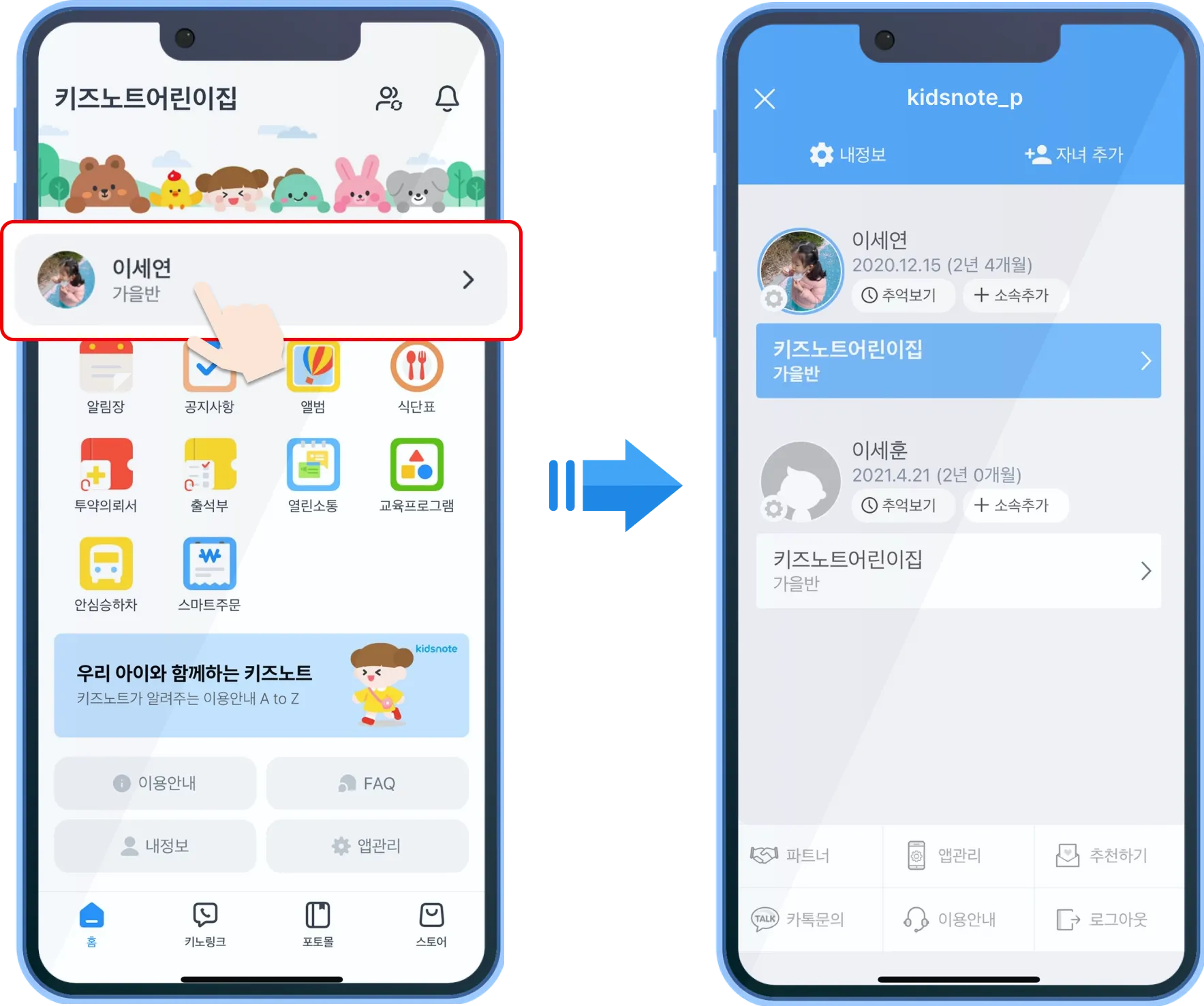 상단에서 자녀의 프로필을 선택하면 자녀가 소속된 원과 반을 확인할 수 있어요.