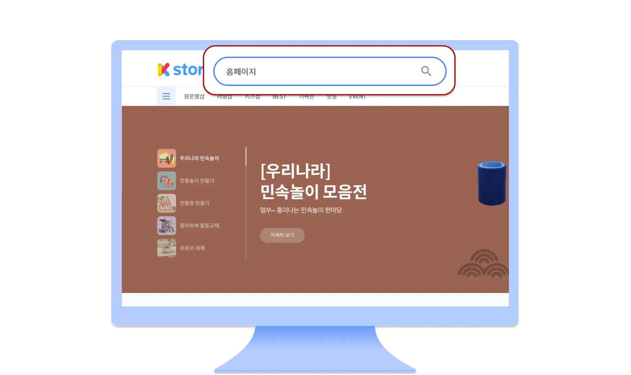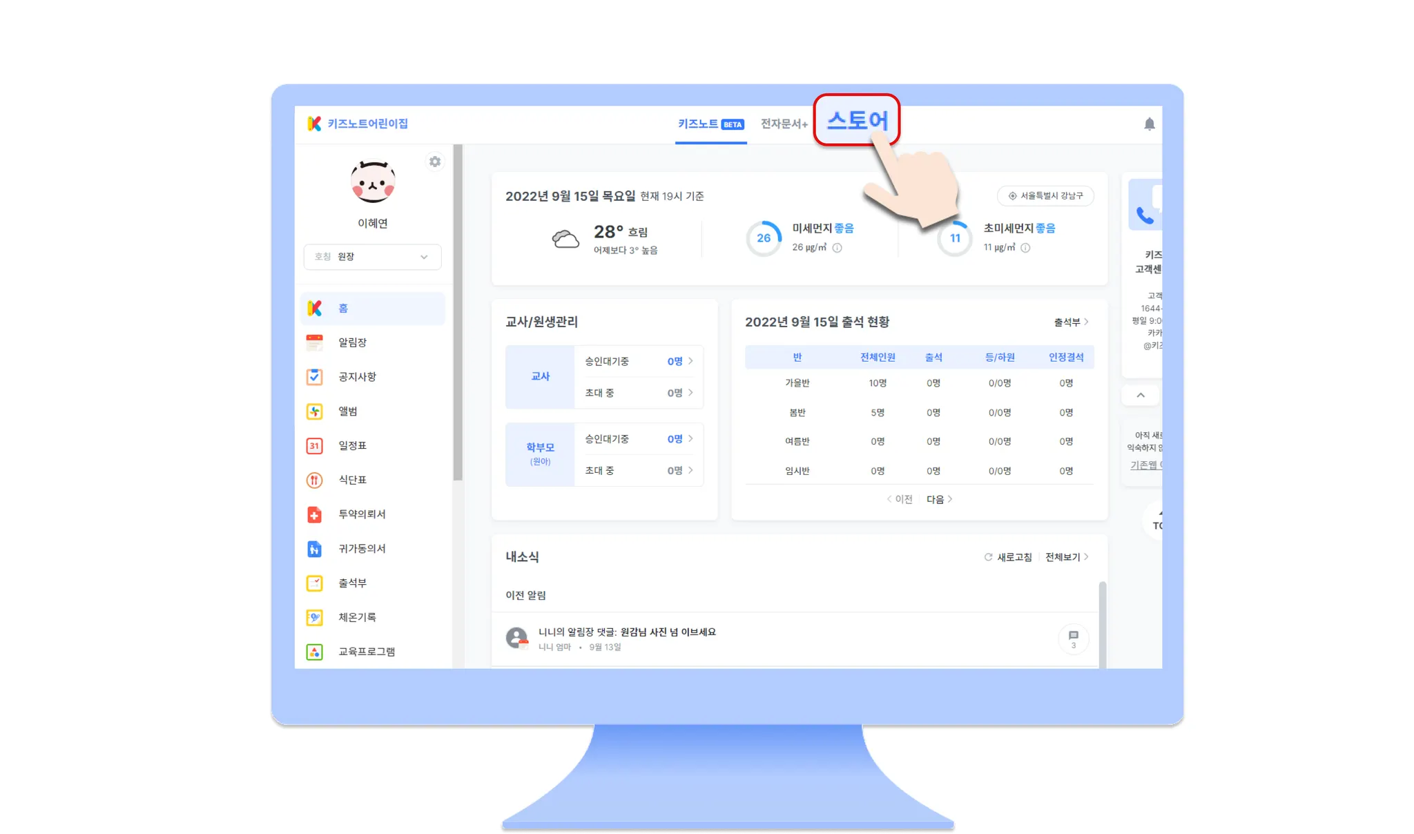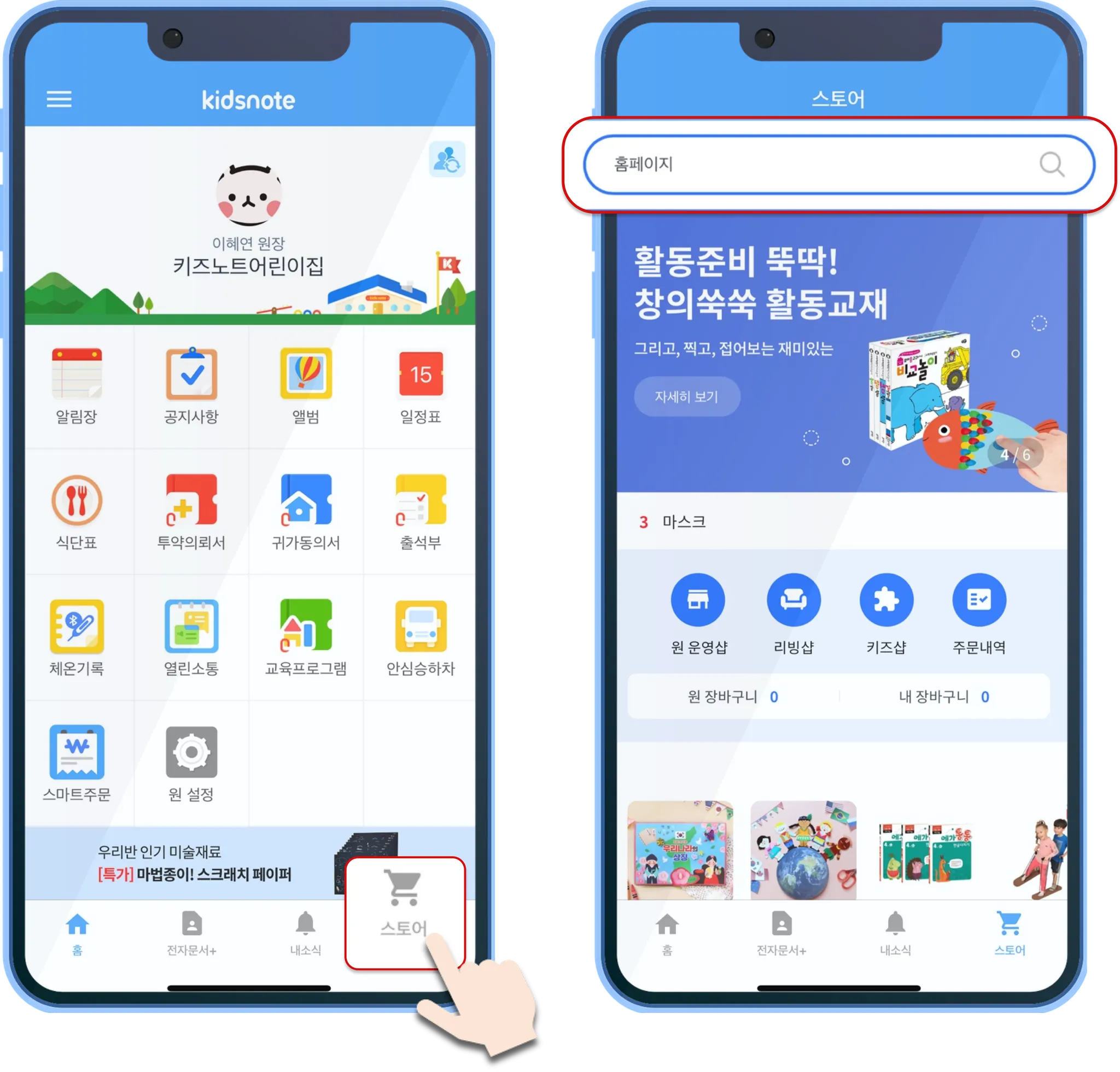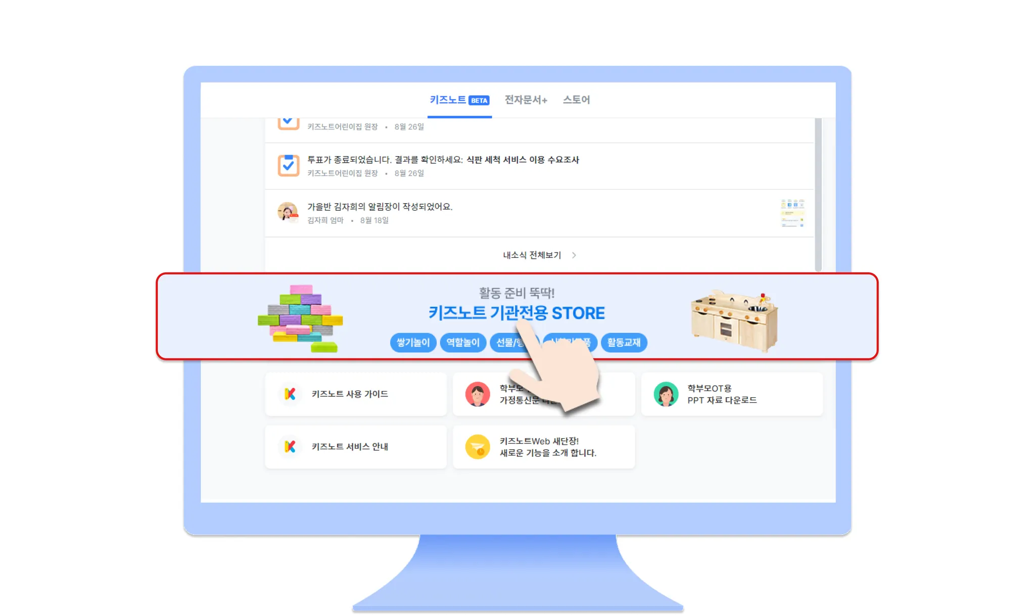 2. PC 홈 화면의 상단에서 스토어를 선택하거나 하단의 키즈노트 기관 전용 스토어배너를 선택합니다.