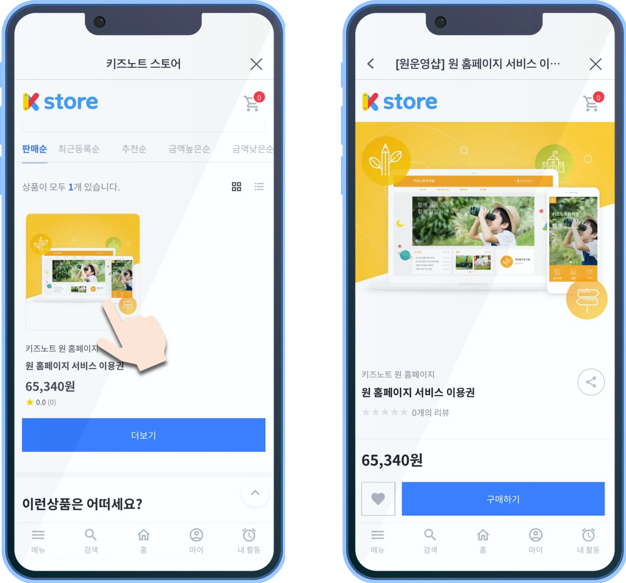 2. 홈화면 하단에 스토어를 선택하고 추천 검색어 #원홈페이지선택 또는 홈페이지/원홈페이지를 검색합니다.