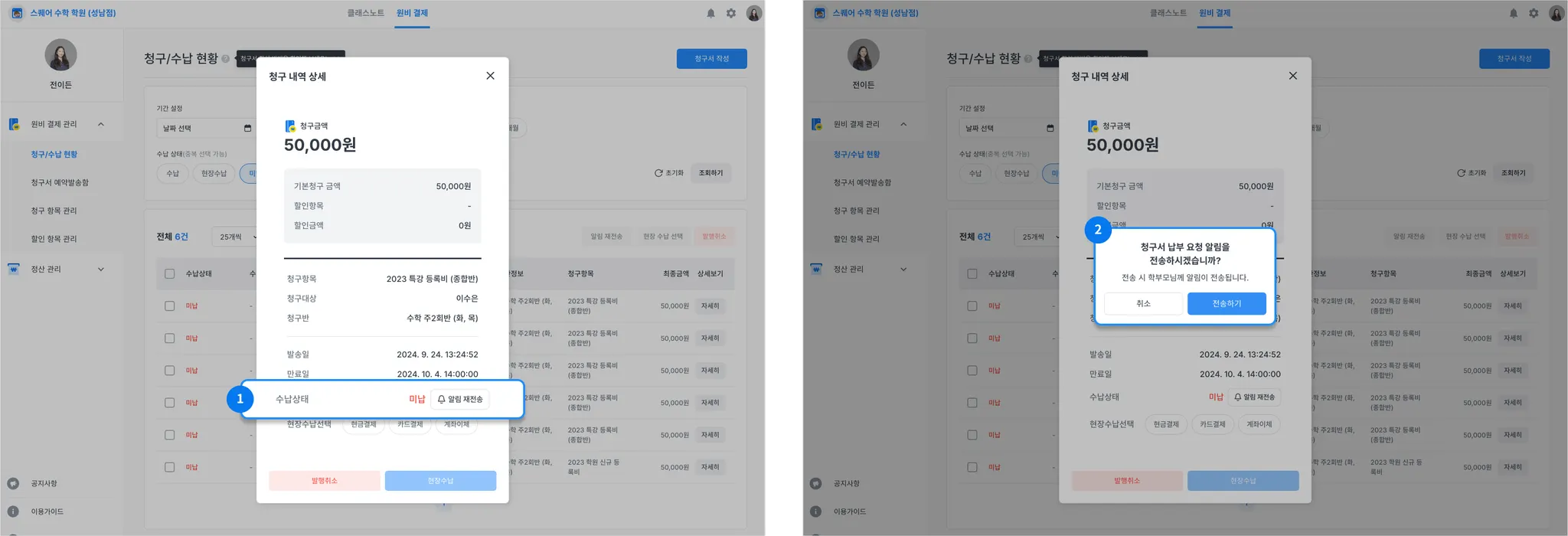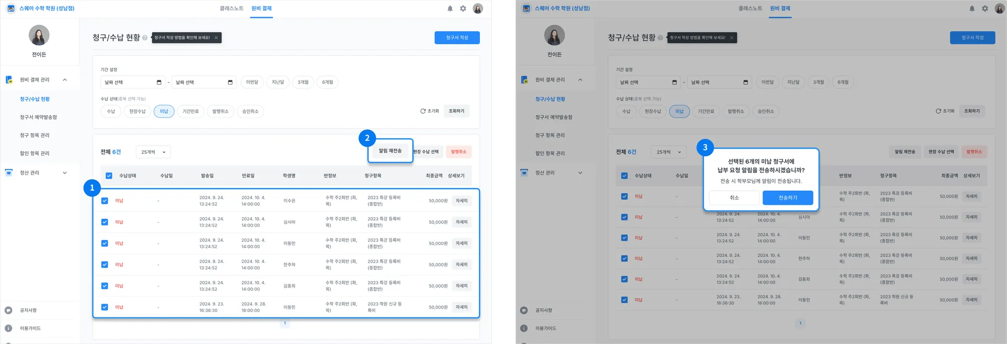 미납 상태의 청구서를 선택해 납부요청 알림을 재전송할 수 있어요