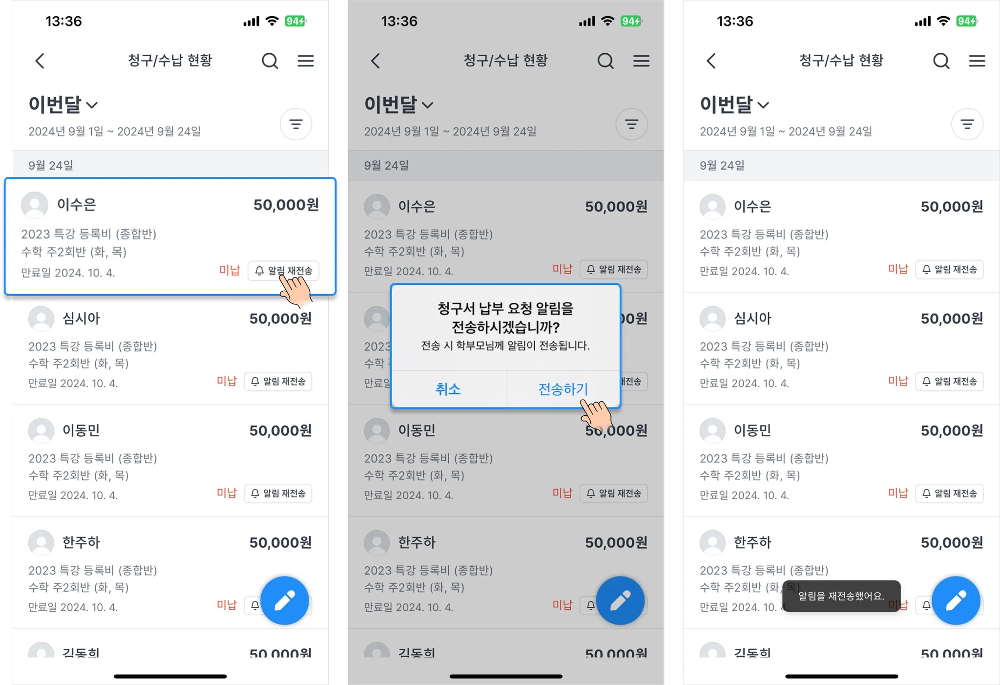 앱의 청구/수납 현황 리스트에서 미납 청구서의 [알림 재전송] 버튼을 확인할 수 있어요.