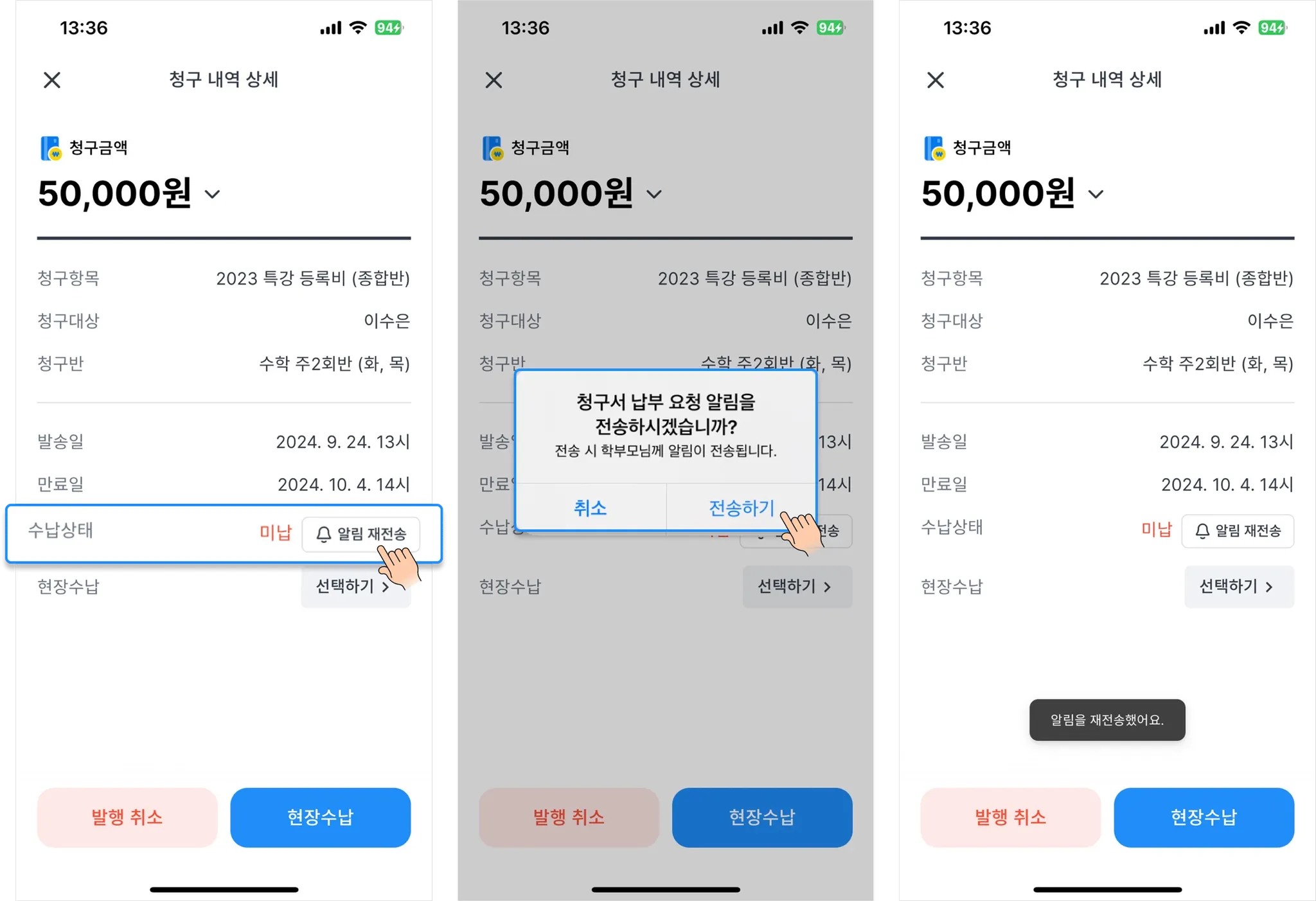 청구서 상세 화면에서도 알림을 재전송할 수 있어요.