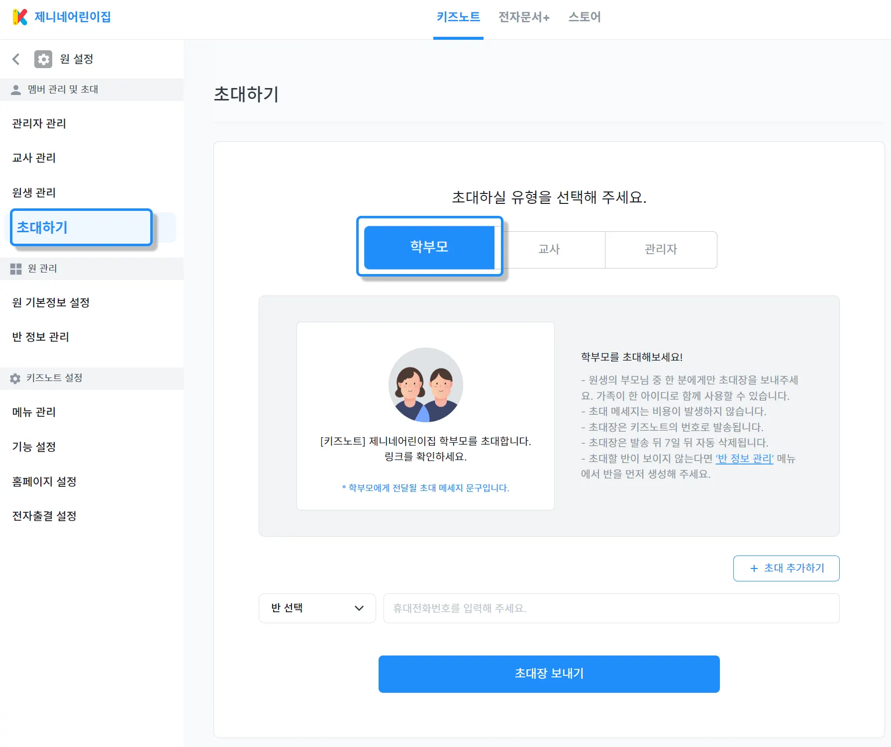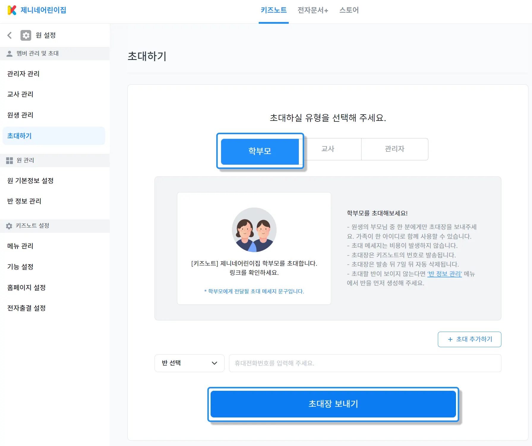 - 초대장은 발송 후 7일 뒤 자동 삭제됩니다. 초대받은 교사/학부모 회원이 7일간 가입하지 않은 경우 다시 초대장을 발송해 주세요.