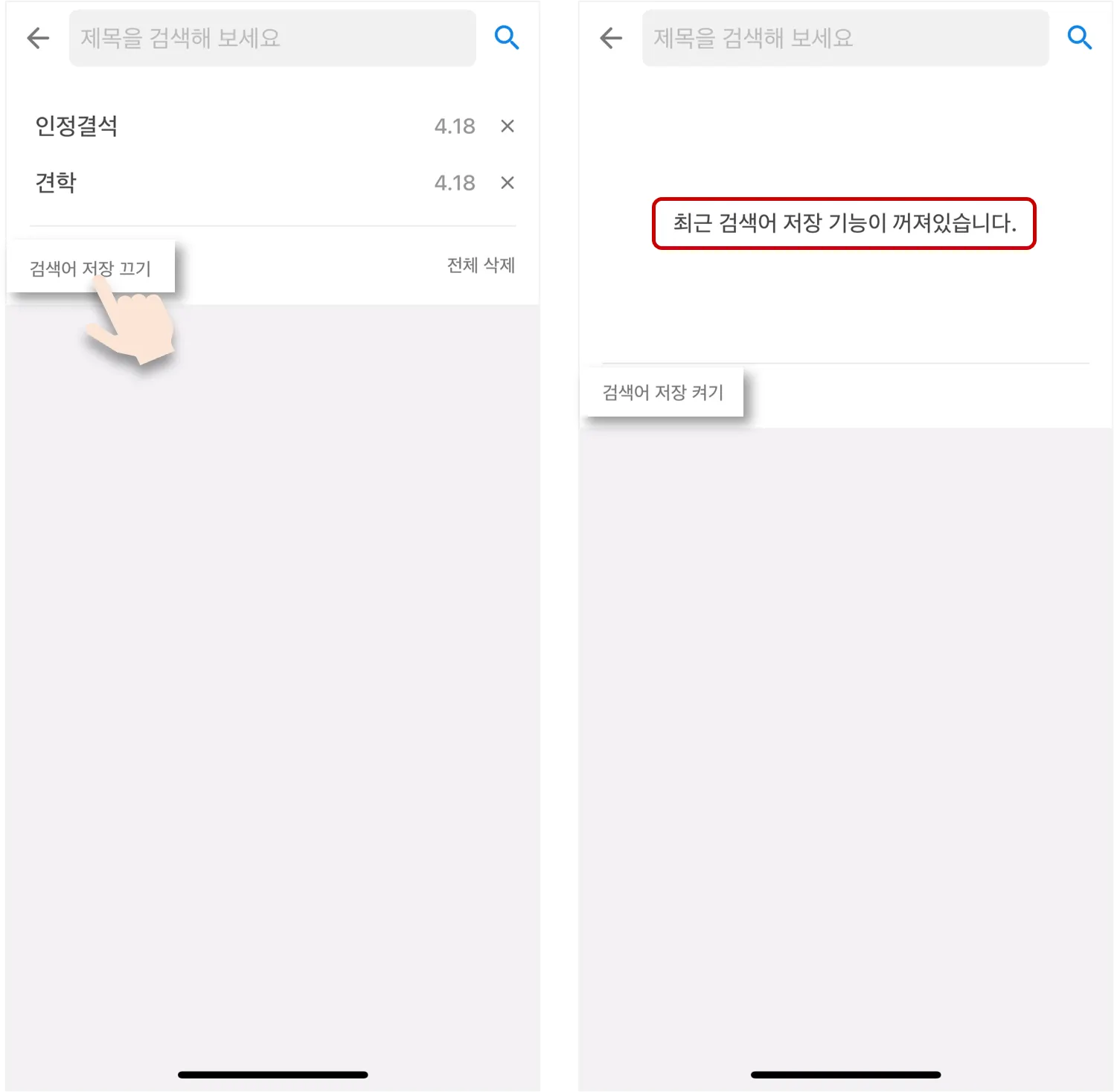- 검색어 저장 끄기인 상태에서 좌측 하단 검색어 저장 켜기버튼을 누르면 다시 검색어 히스토리가 남겨집니다.