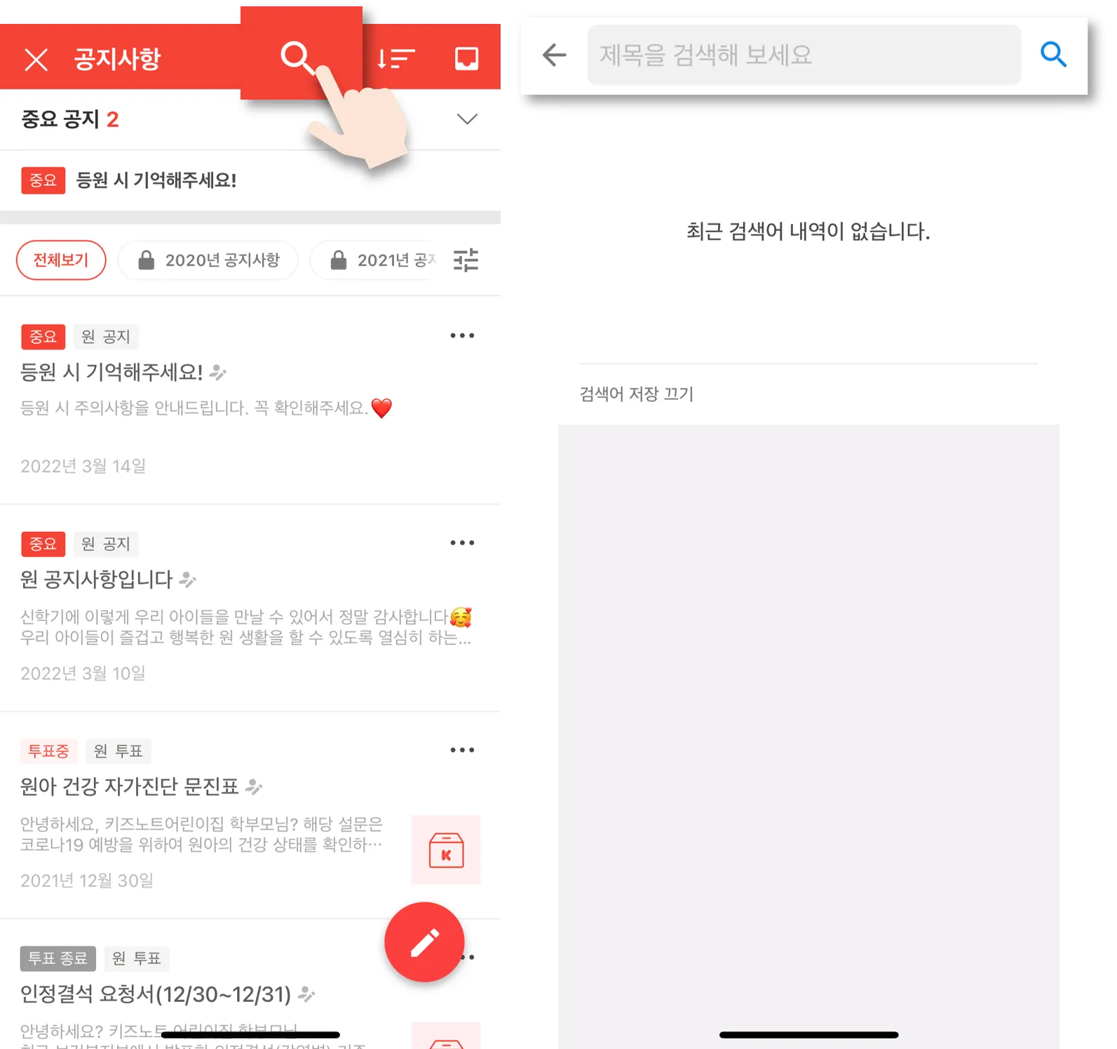 - 돋보기 아이콘 선택 시 검색 화면으로 이동합니다.