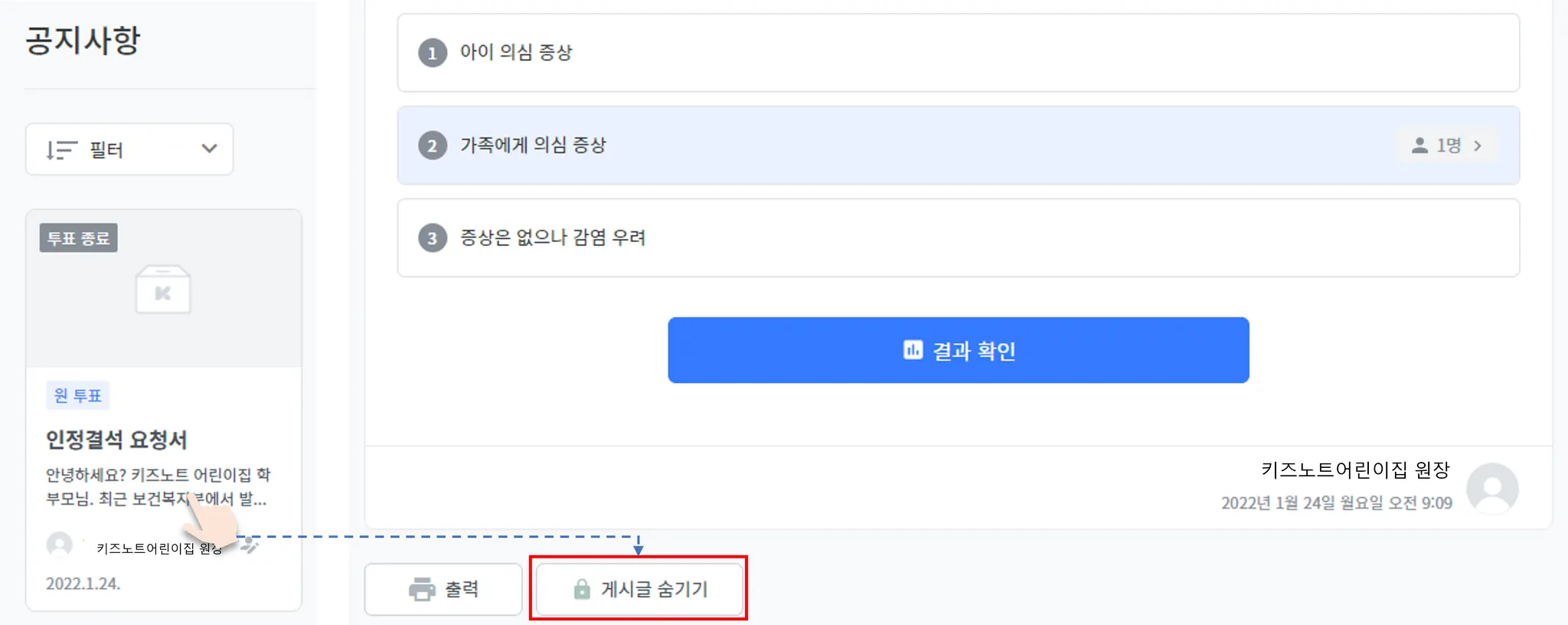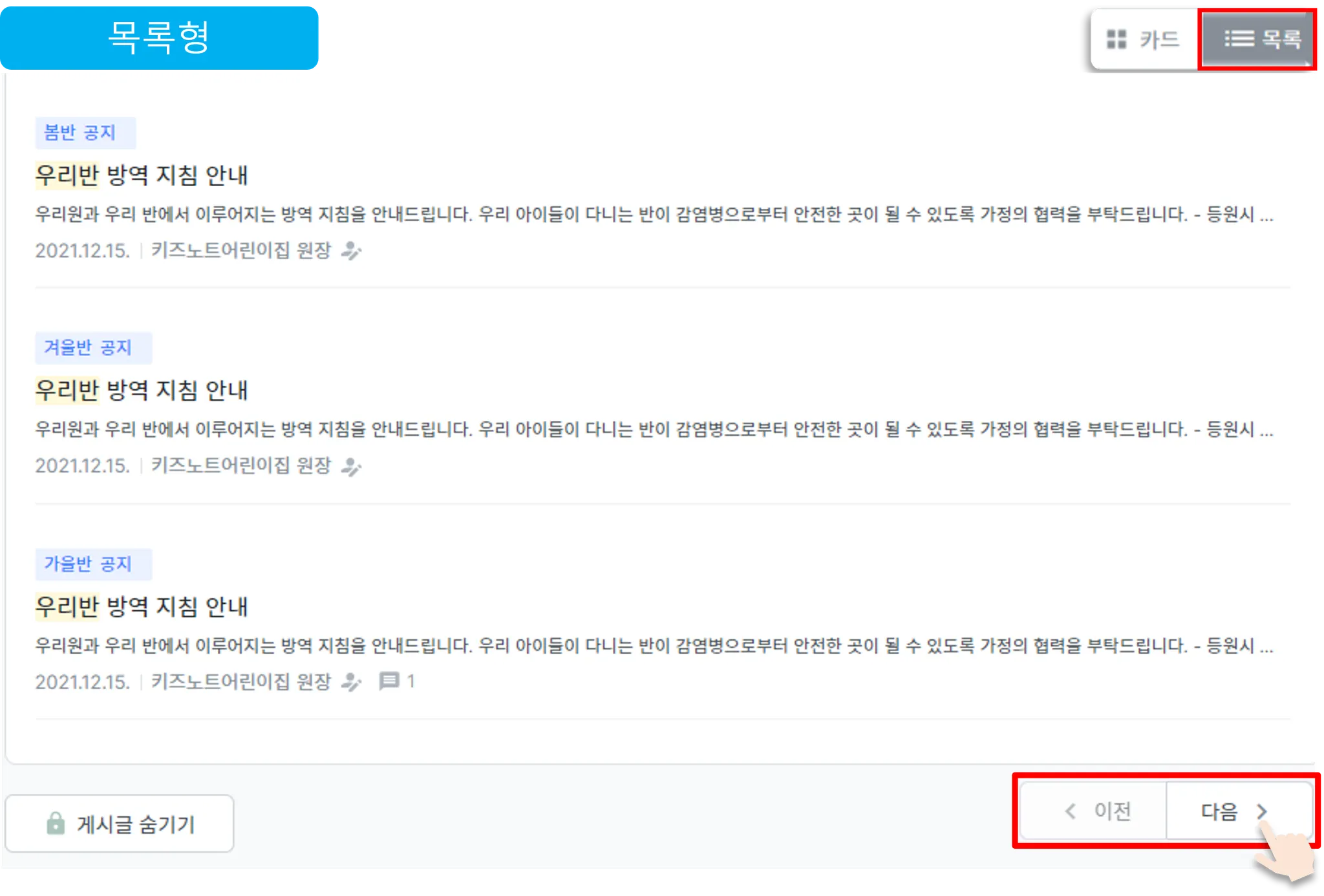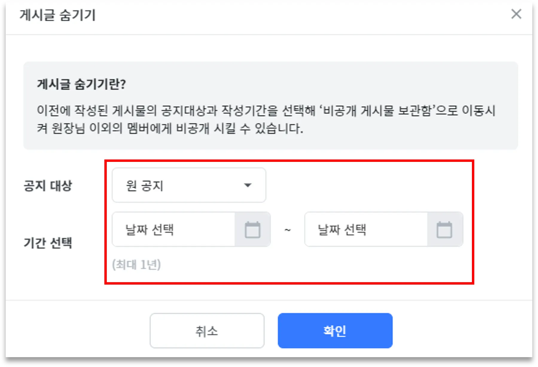 게시물 숨기기 기능으로 이전에 작성된 게시물의 공지대상과 작성기간을 선택해 '비공개 게시물 보관함'으로 이동시켜 원장님 이외의 다른 멤버에게 비공개 시킬 수 있습니다.
