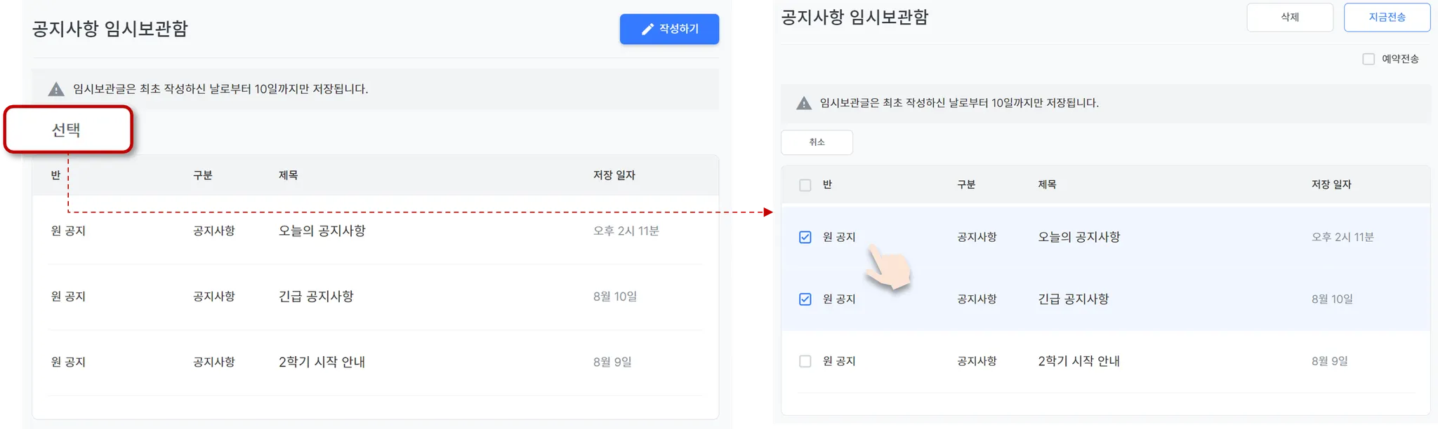 좌측의 선택 버튼을 클릭하면 여러 개의 공지사항을 선택하고 전송, 삭제, 예약 전송 할 수 있어요.