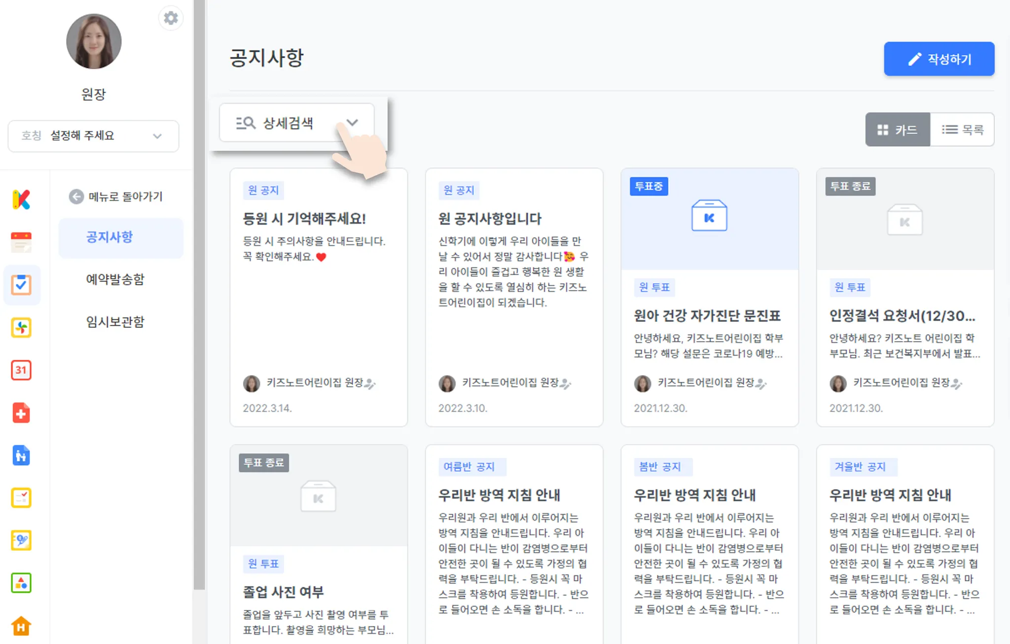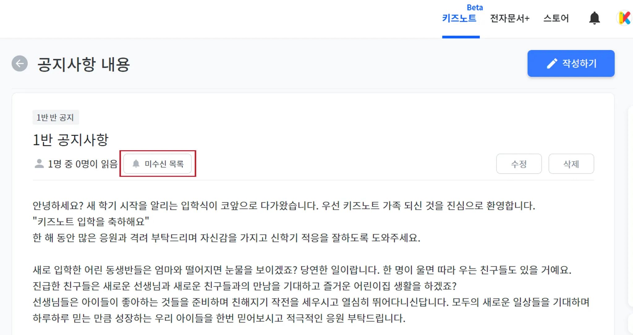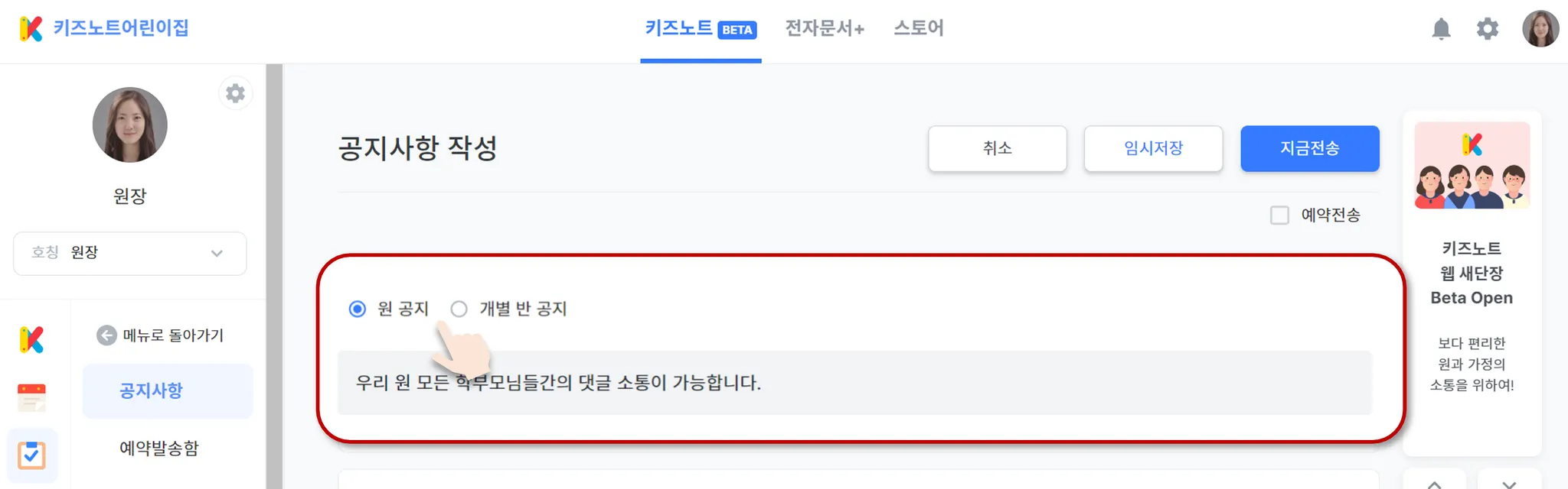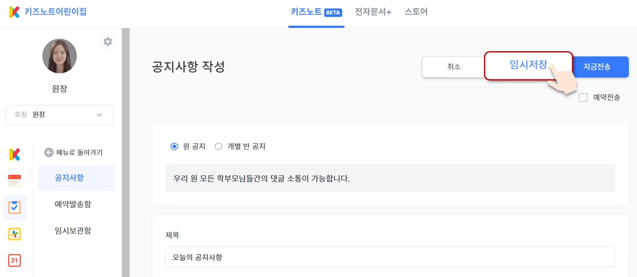 - 원장님 : 전체 반, 원 공지, 반 별 선택 가능