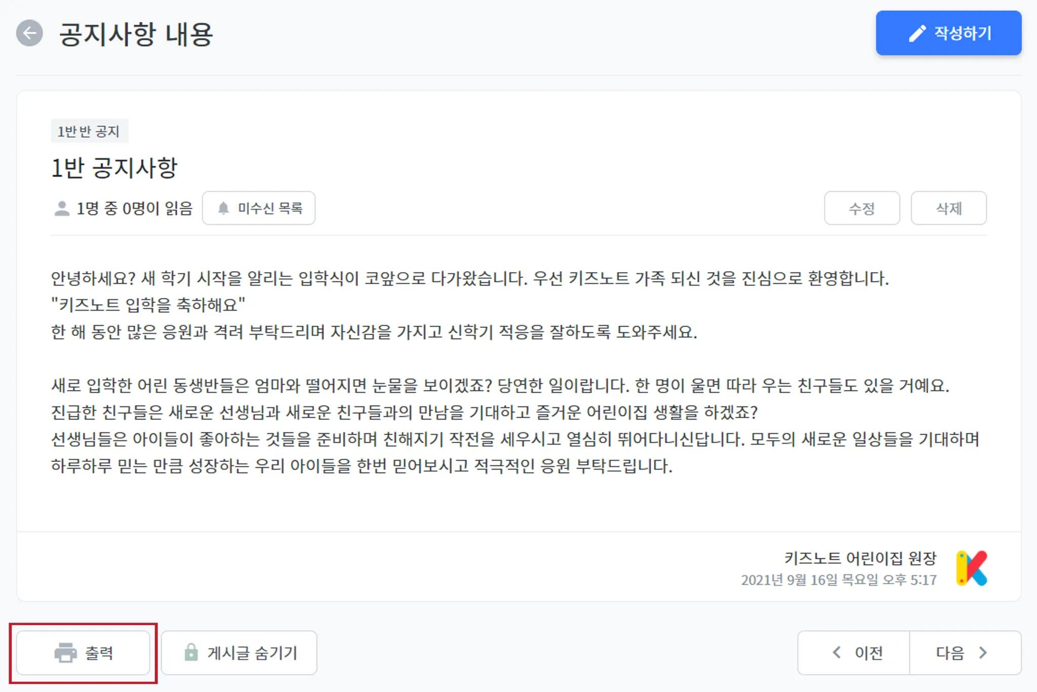 출력 기능을 통해서는 해당 공지사항을 바로 출력할 수 있습니다.