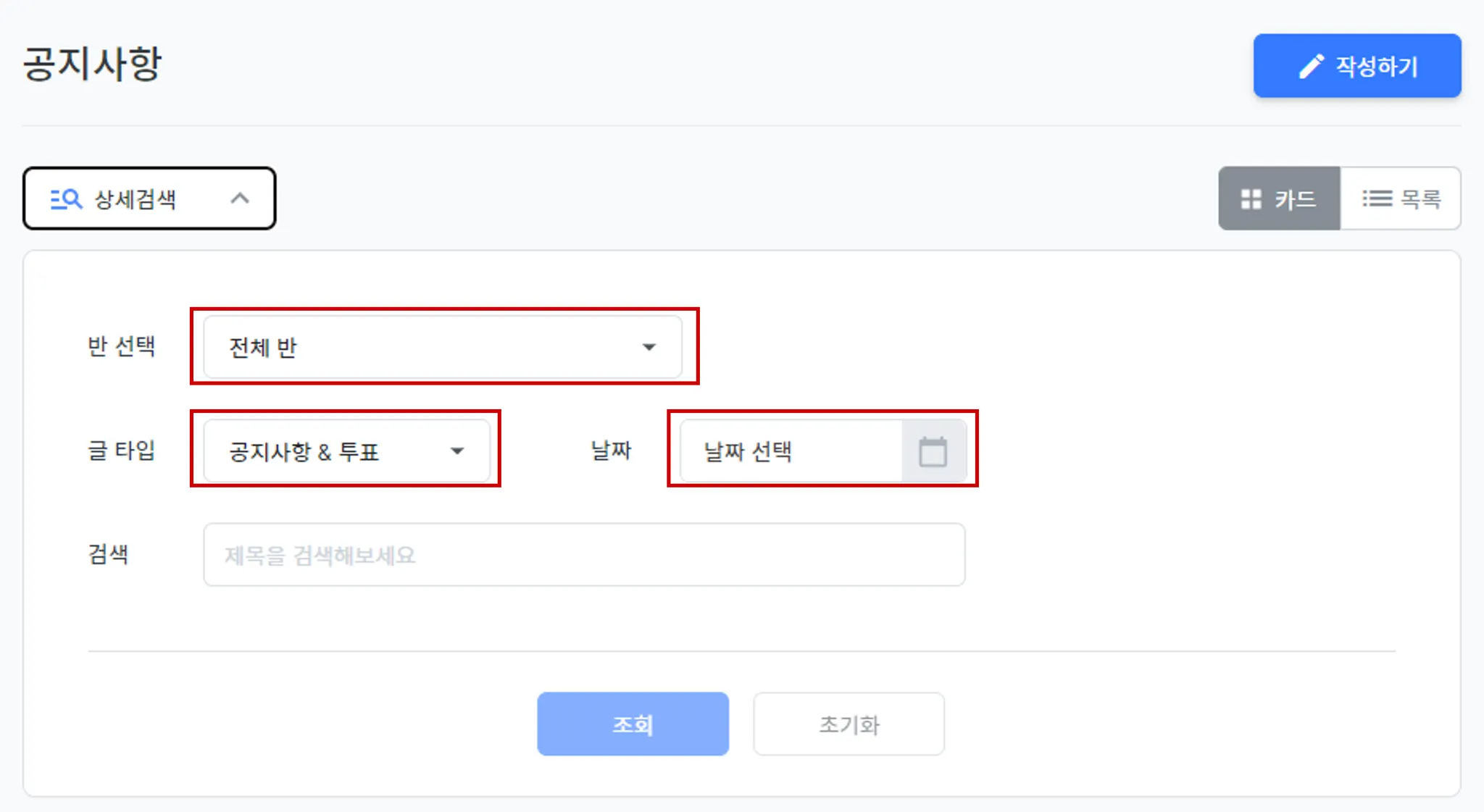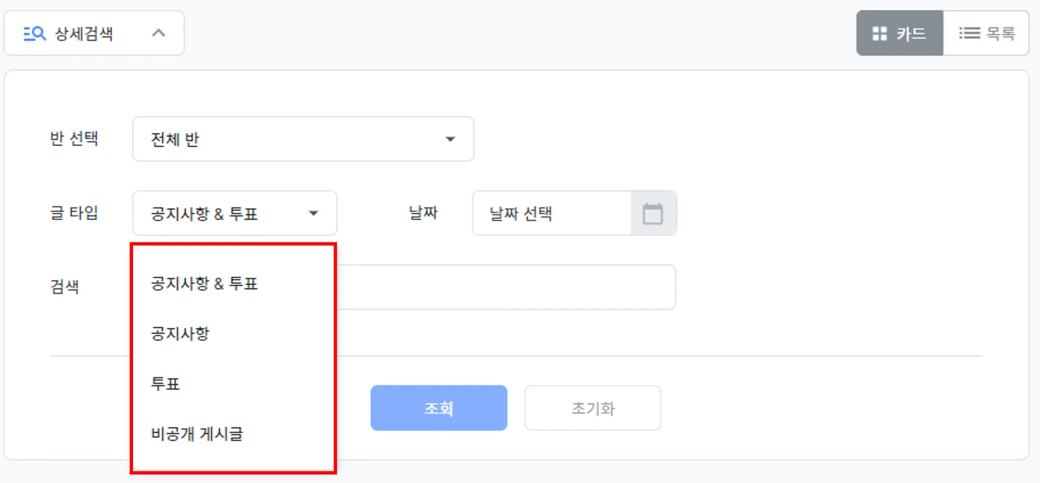반 선택, 글 타입, 날짜 필터를 선택할 수 있습니다.