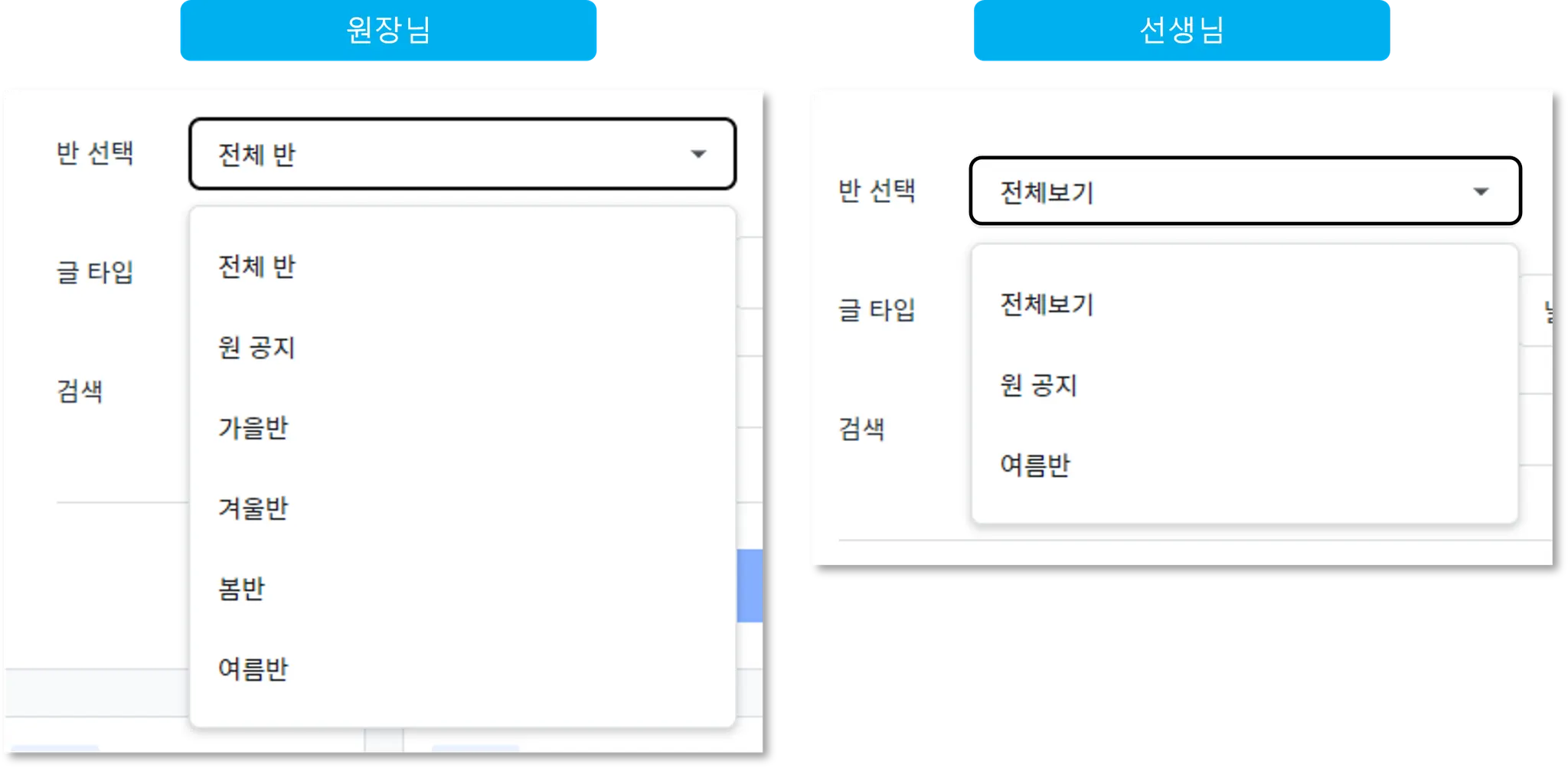 - 선생님 : 전체보기, 원 공지, 본인이 소속된 반만 선택 가능