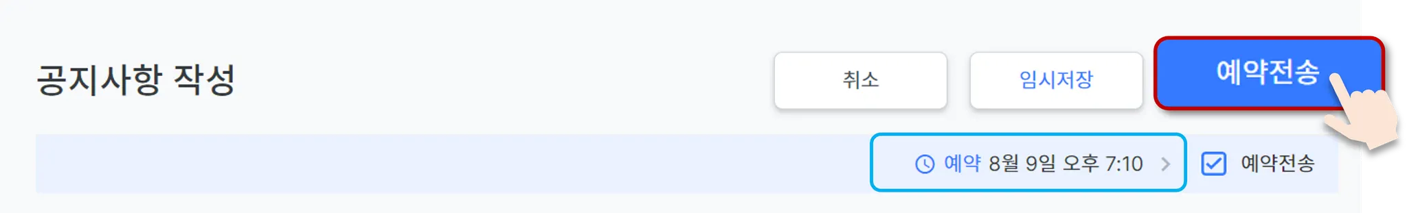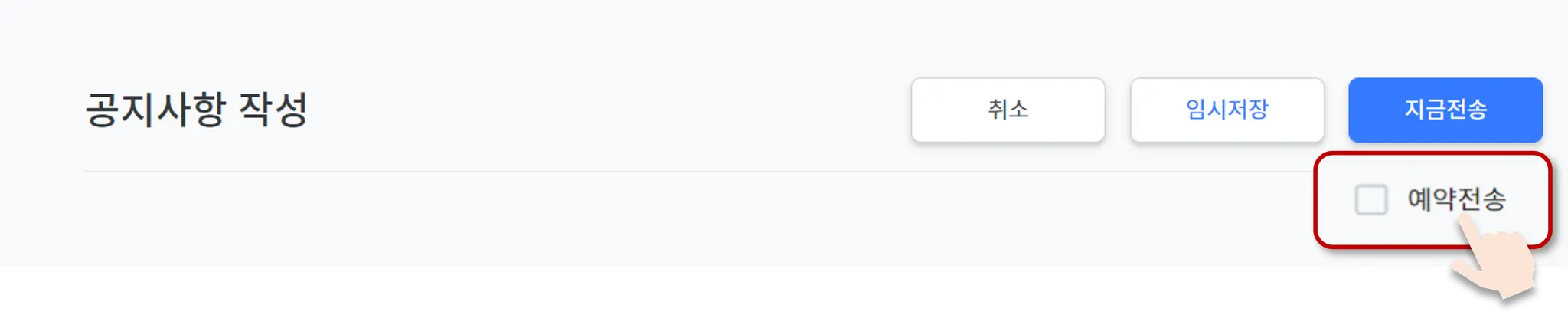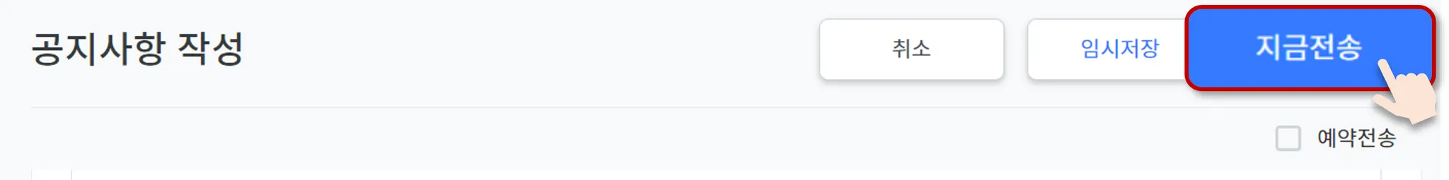 작성한 공지사항을 예약발송 하려면, 우측 상단의 예약전송 버튼을 눌러주세요.