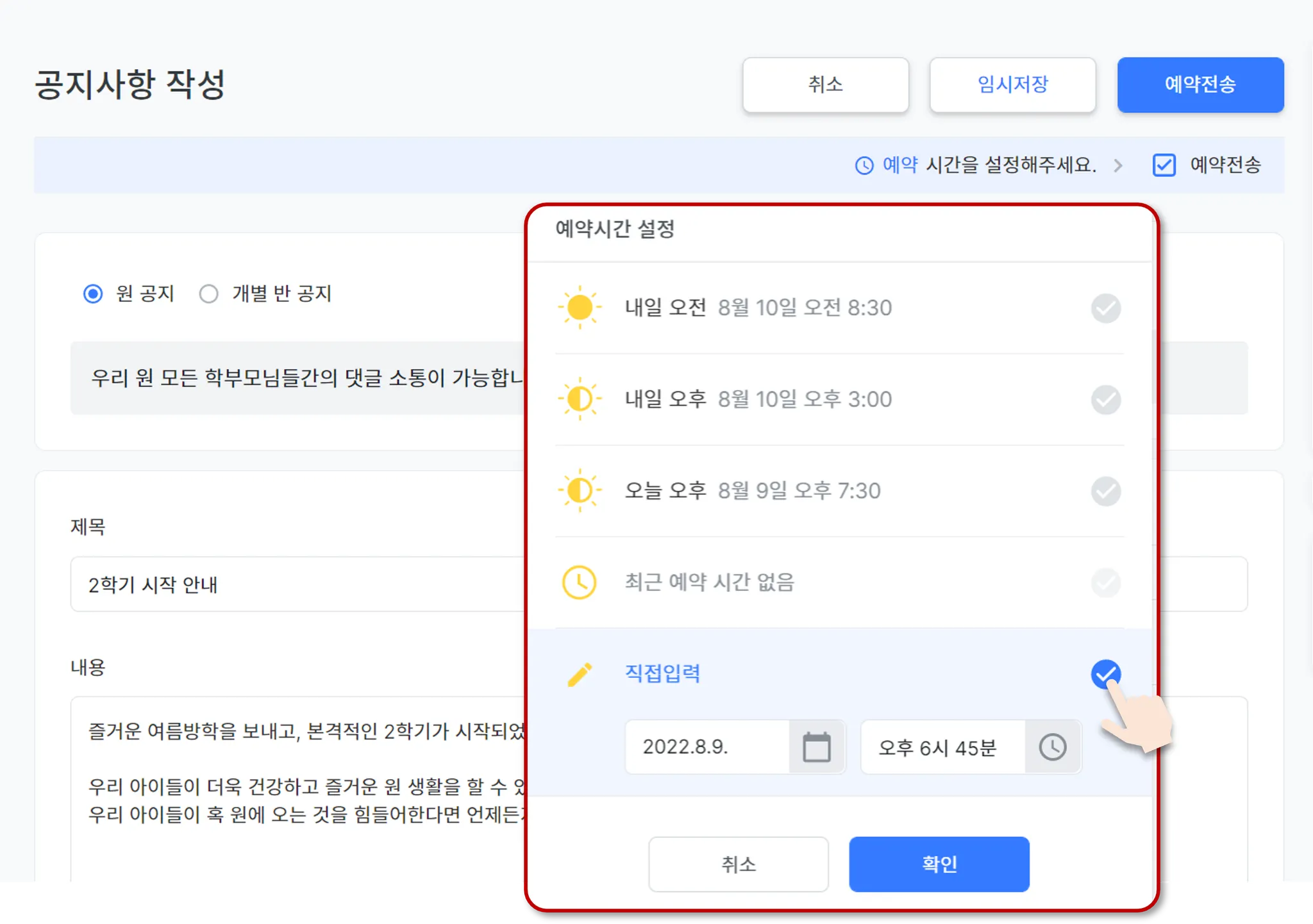 예약시간을 설정해주세요. 추천하는 예약시간을 선택하거나 직접입력을 선택하여 해당 공지글을 전송할 시간을 직접 설정할 수 있습니다.