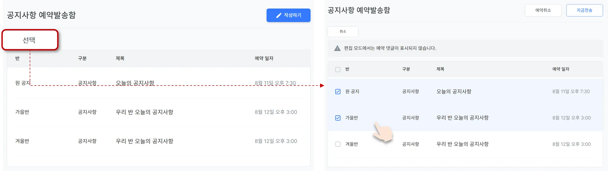 좌측의 선택 버튼을 클릭하면 여러 개의 공지사항을 선택하고 예약 취소, 지금 전송 할 수 있어요.