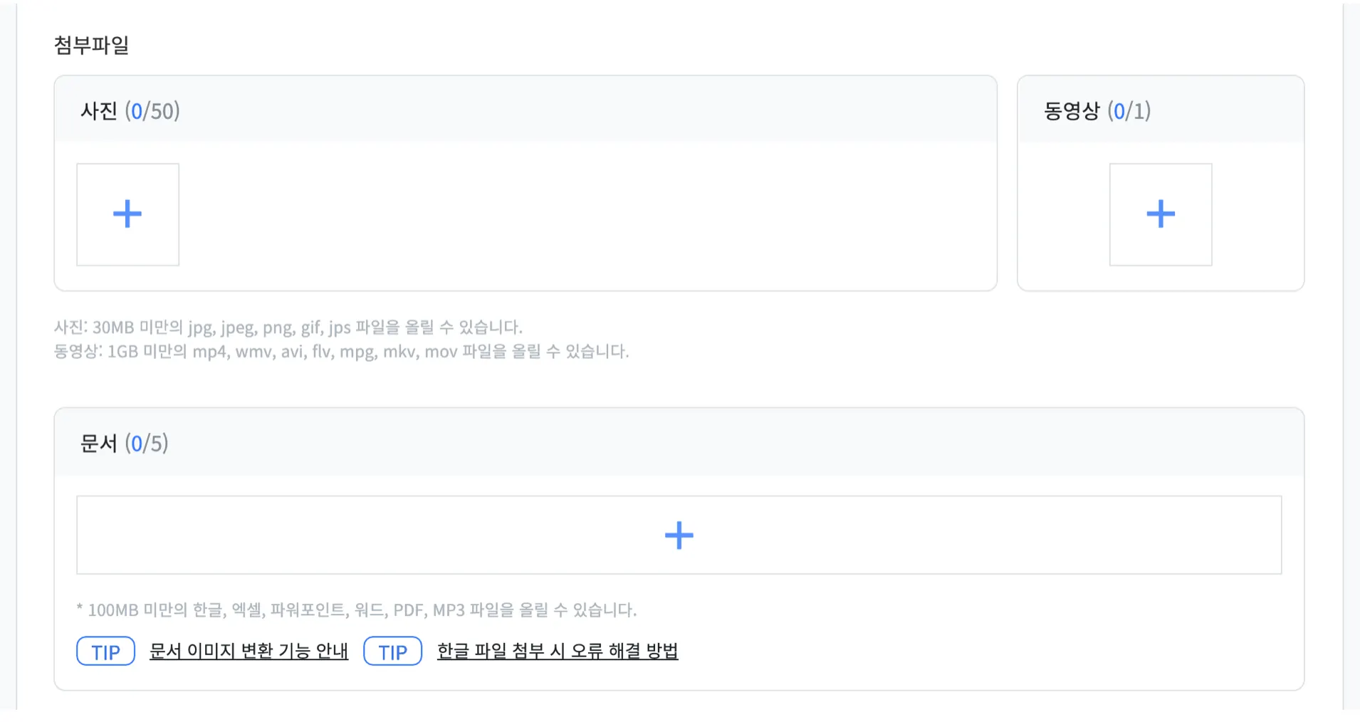 - 첨부파일 개수 : 사진 최대 50장, 동영상 1개, 문서 최대 5개 (단, 동영상과 동시 업로드 시 사진은 최대 49장까지 업로드 가능)