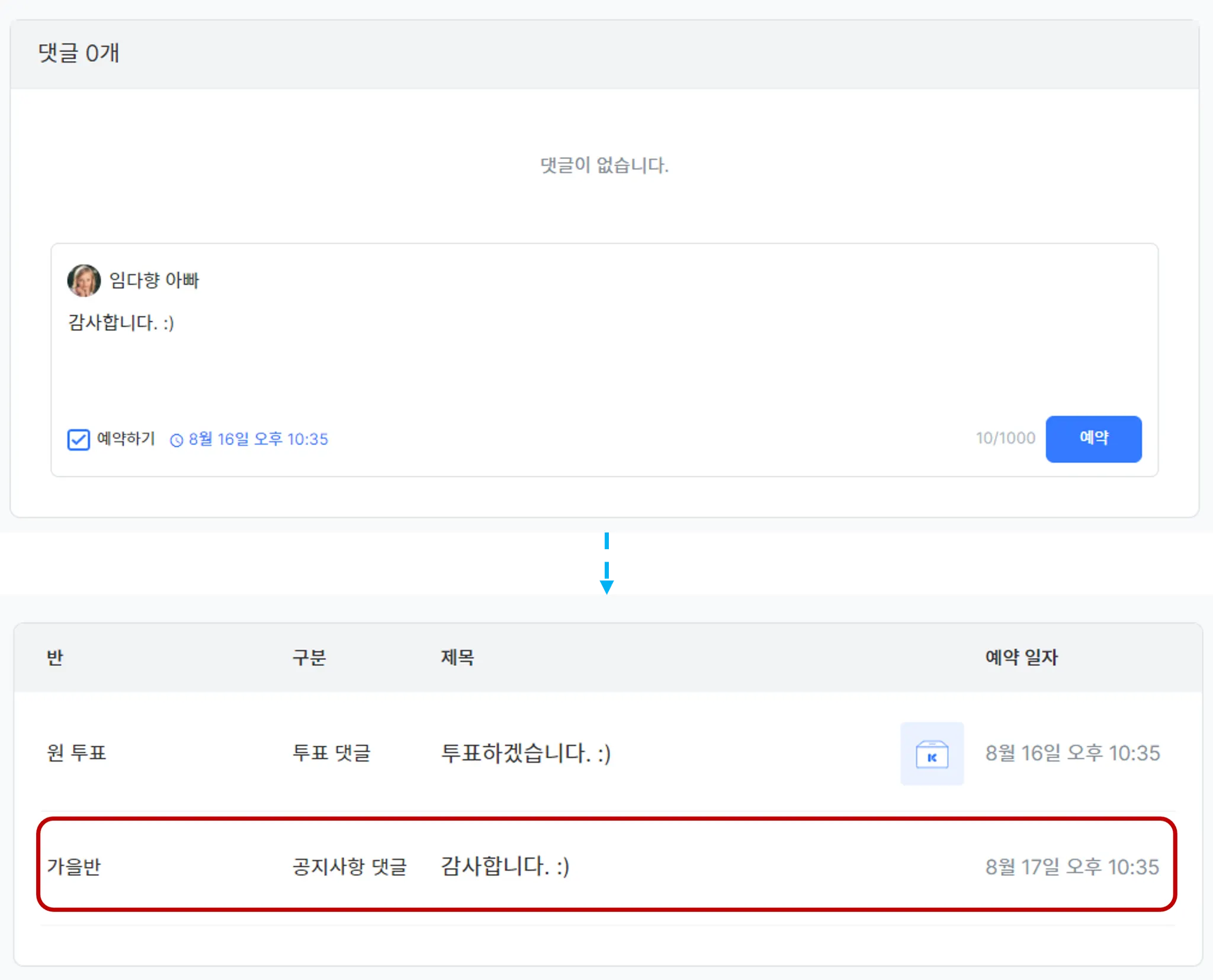 - 예약하기를 선택하면 해당 댓글을 예약하여 설정한 예약시간에 발송할 수 있습니다.