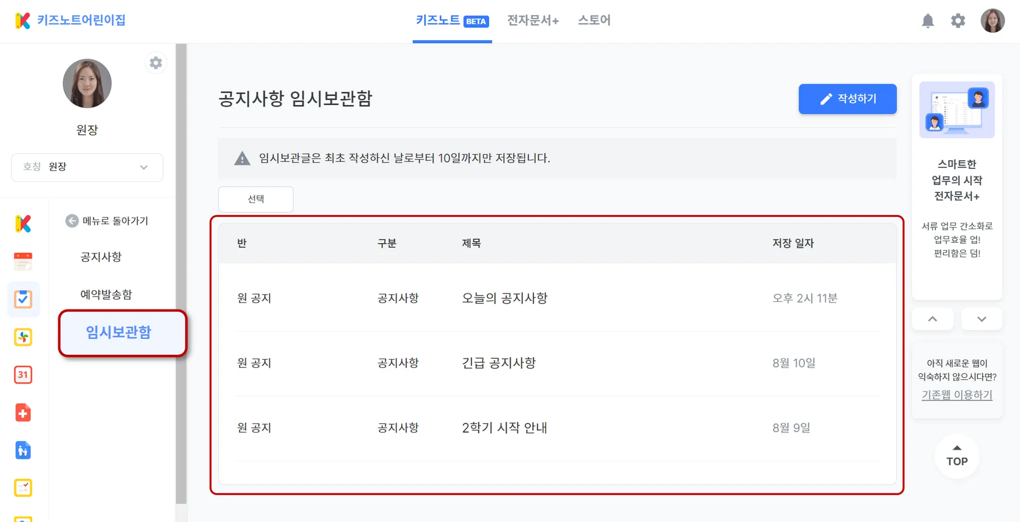 공지사항 작성 후 임시저장을 선택하면 작성한 공지사항을 임시저장 할 수 있습니다.