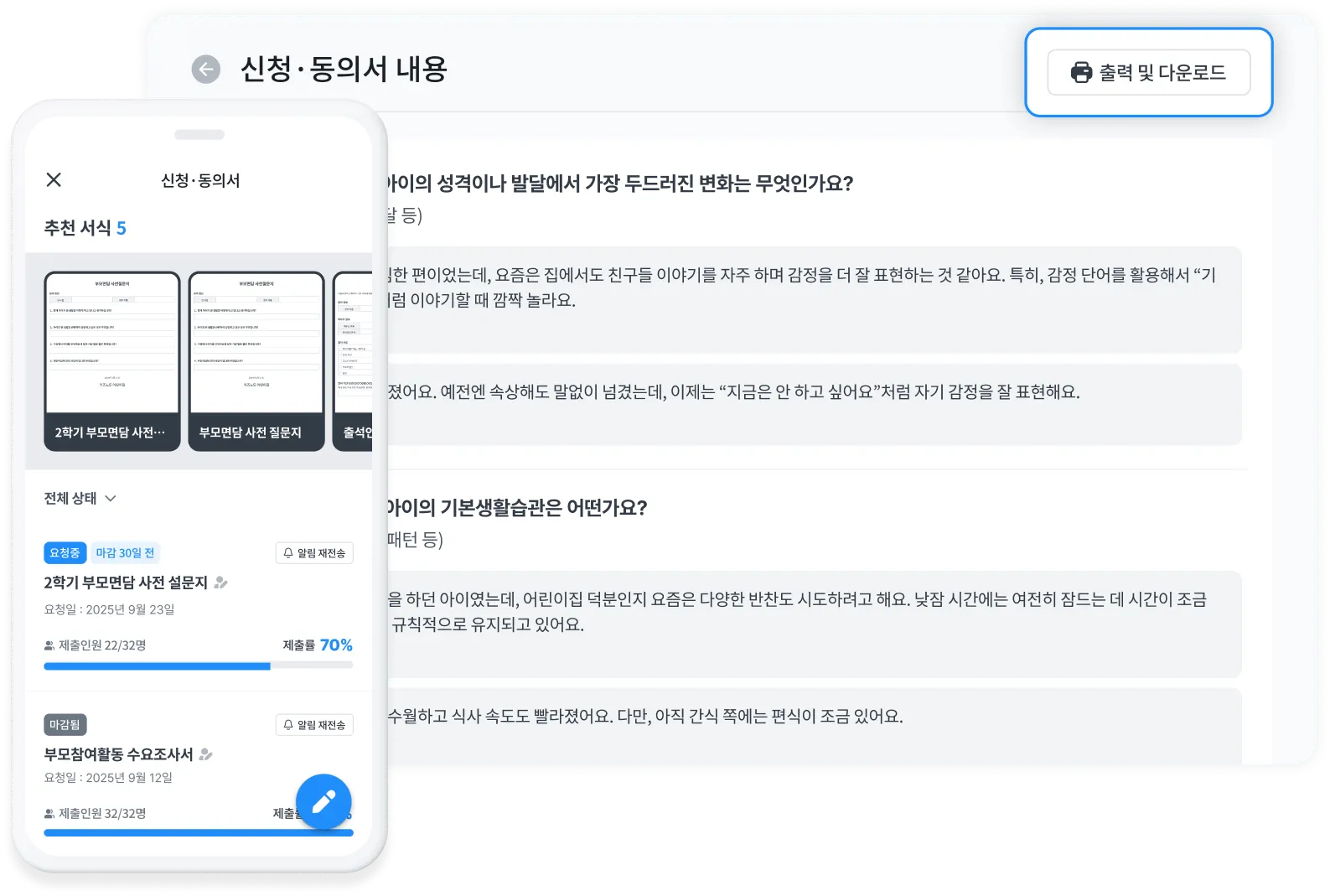 응답 현황은 실시간으로 확인할 수 있으며, 필요한 경우 PC에서 출력 및 다운로드하여 관리도 가능해요.
