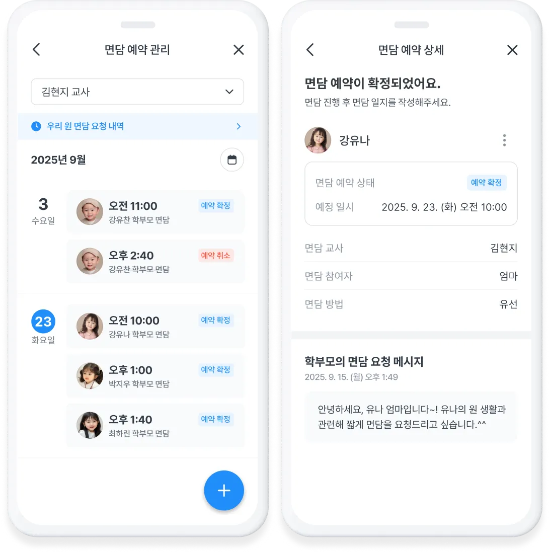 푸시 알림으로 즉시 전송되어 학부모님이 빠르게 확인할 수 있으며, 이 과정에서 일정을 조율할 수도있어요.