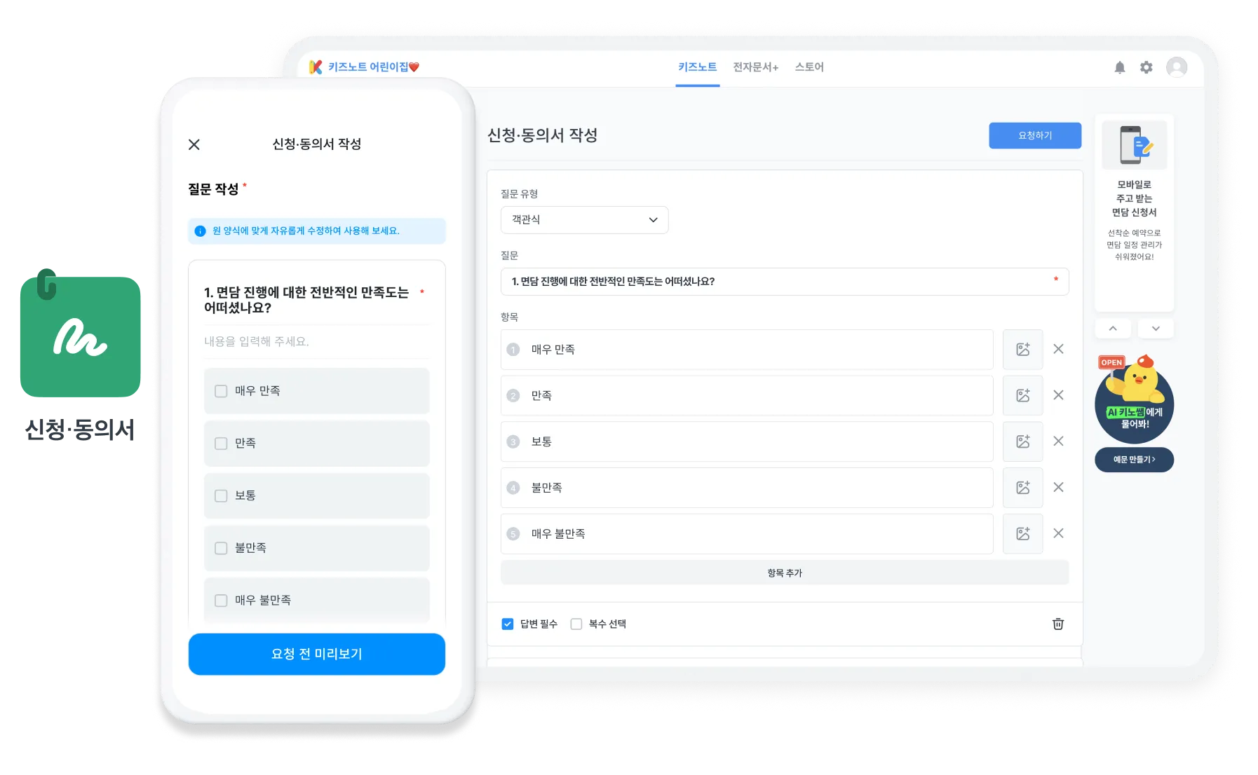 키즈노트 홈 화면 → ‘신청·동의서’ 메뉴 → ‘부모면담 만족도 조사’ 서식 선택