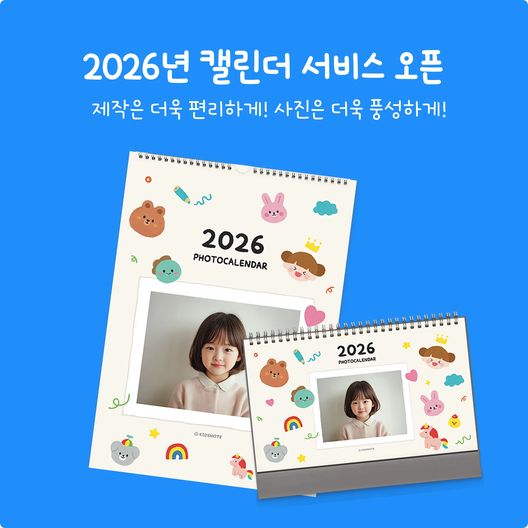 편집 기능은 더 간편하게, 구성은 더 풍성하게 포토몰 캘린더 서비스가 새롭게 찾아왔습니다. 우리 아이 사진이 담긴 특별한 2026년 캘린더를 만들어보세요.