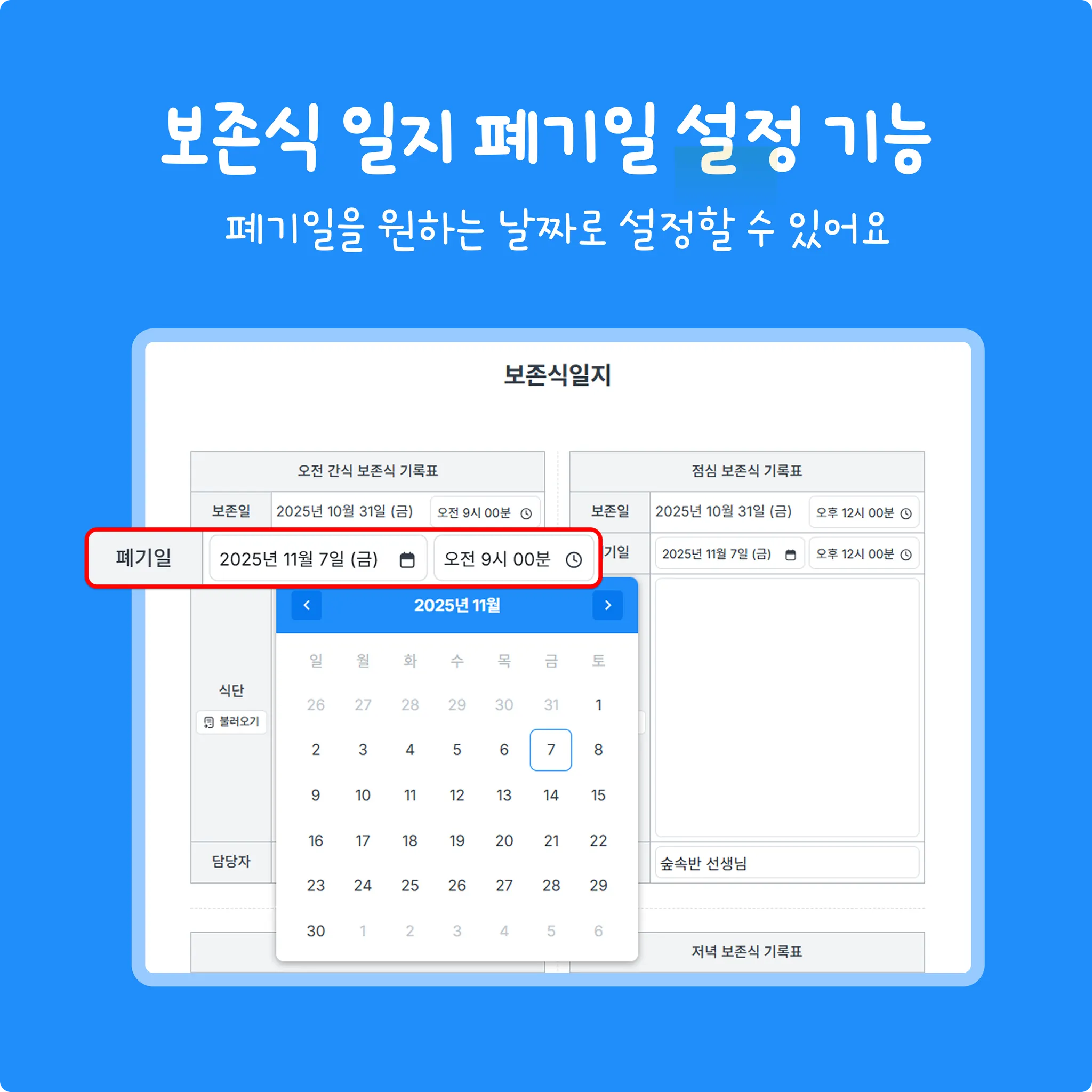 전자문서+ 보존식일지 서식에서 폐기일을 직접 설정할 수 있습니다. 이제 공휴일이나 명절이 있는 주에는 현장 상황에 맞춰 원하는 날짜로 폐기일을 지정해 보세요.