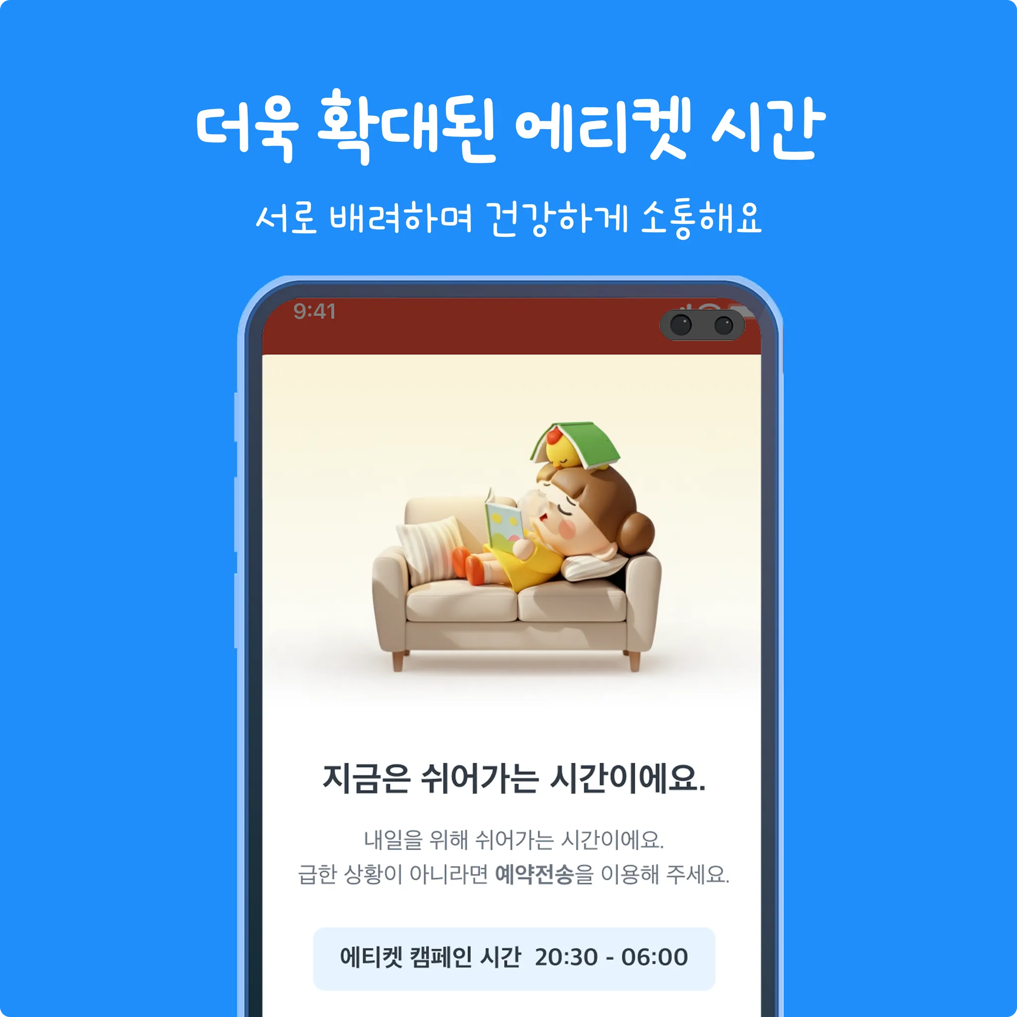 서로 배려하는 소통 문화를 위해 11월부터 에티켓 캠페인 시간이 확대 적용됩니다. 급한 상황이 아니라면 주말과 저녁 시간에는 ‘알림장 예약 발송’으로 서로의 시간을 존중해 주세요.