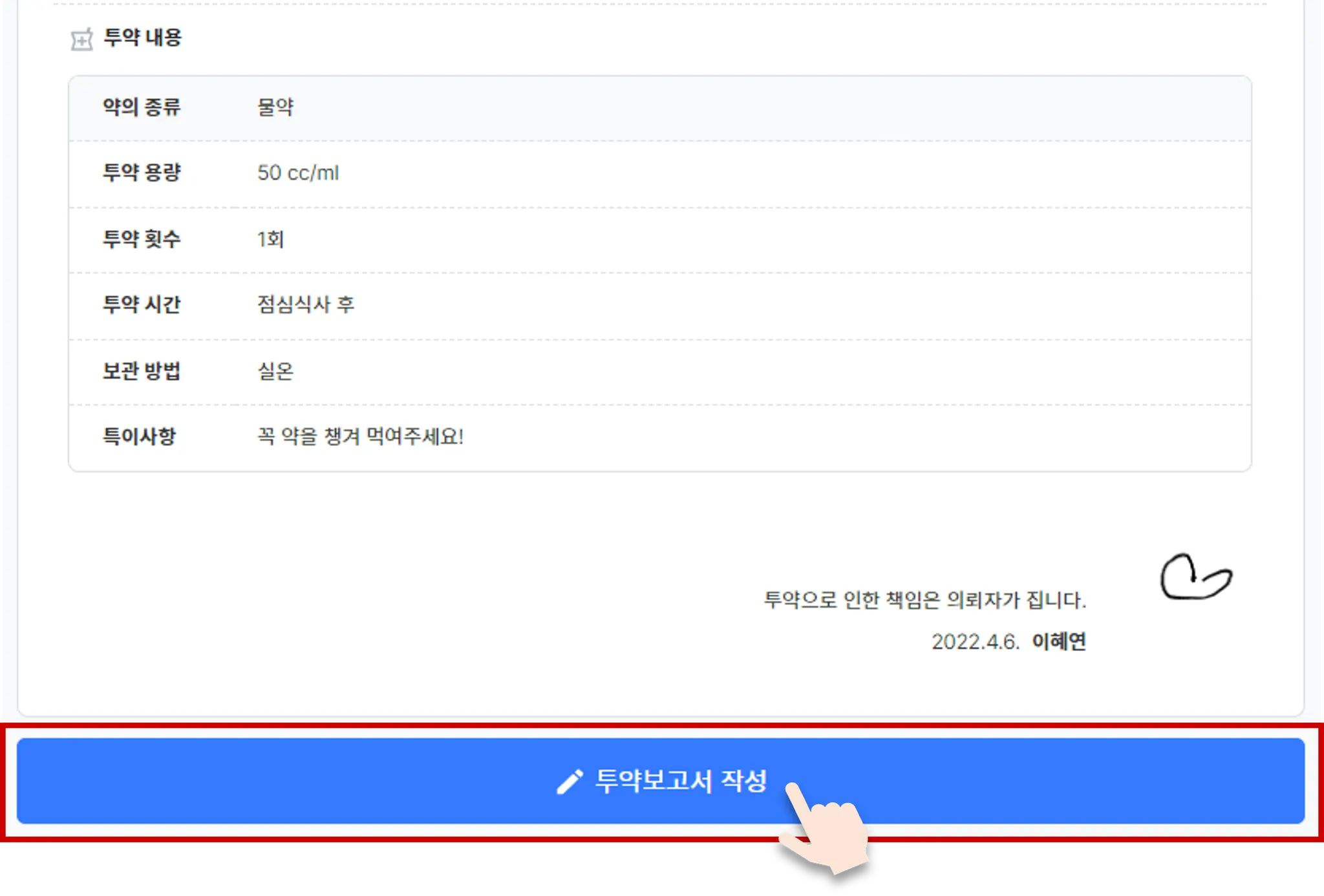투약을 완료하였으면 투약보고서 작성을 클릭합니다.