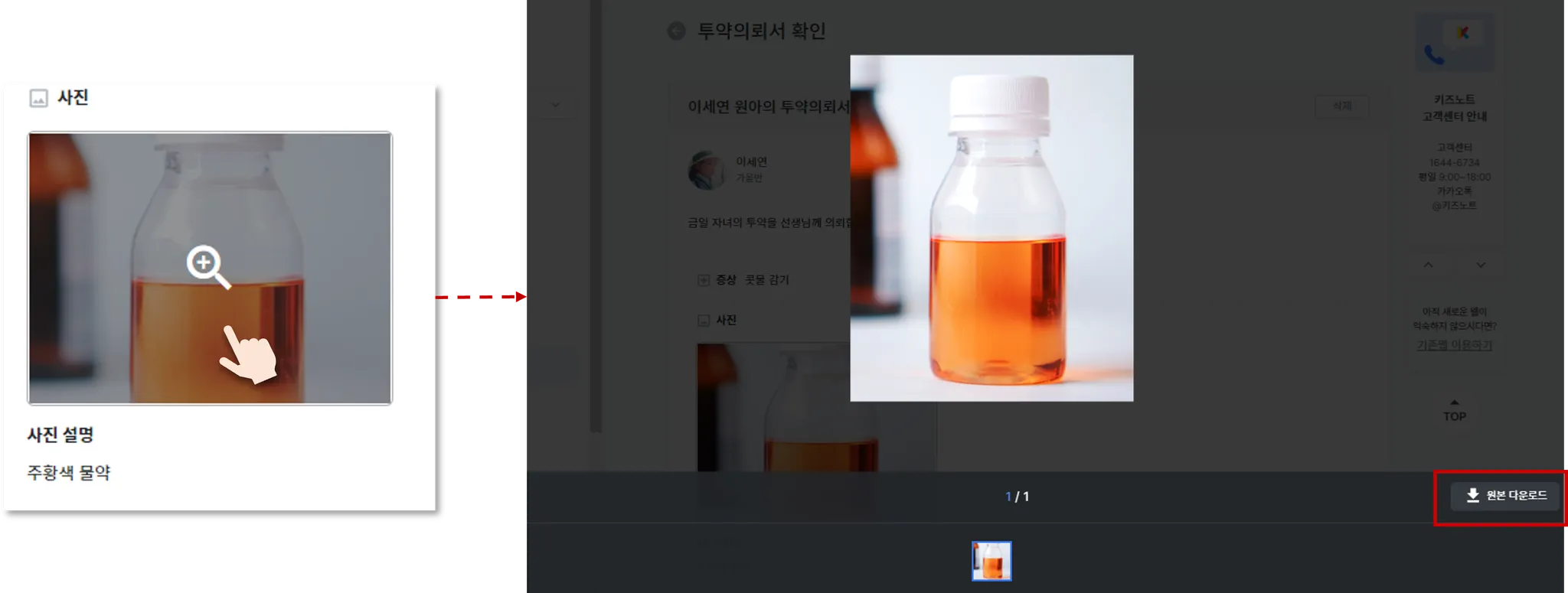 투약 사진이 첨부된 경우, 사진에 마우스를 올리면 돋보기 아이콘이 나타납니다. 아이콘 선택 시 사진을 전체화면으로 볼 수 있으며 원본 다운로드도 가능합니다.