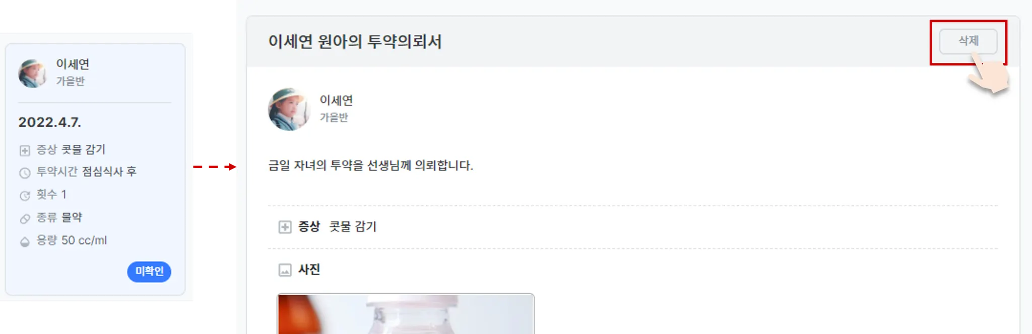 원장님은 부모님이 작성한 투약의뢰서를 삭제할 수 있습니다.