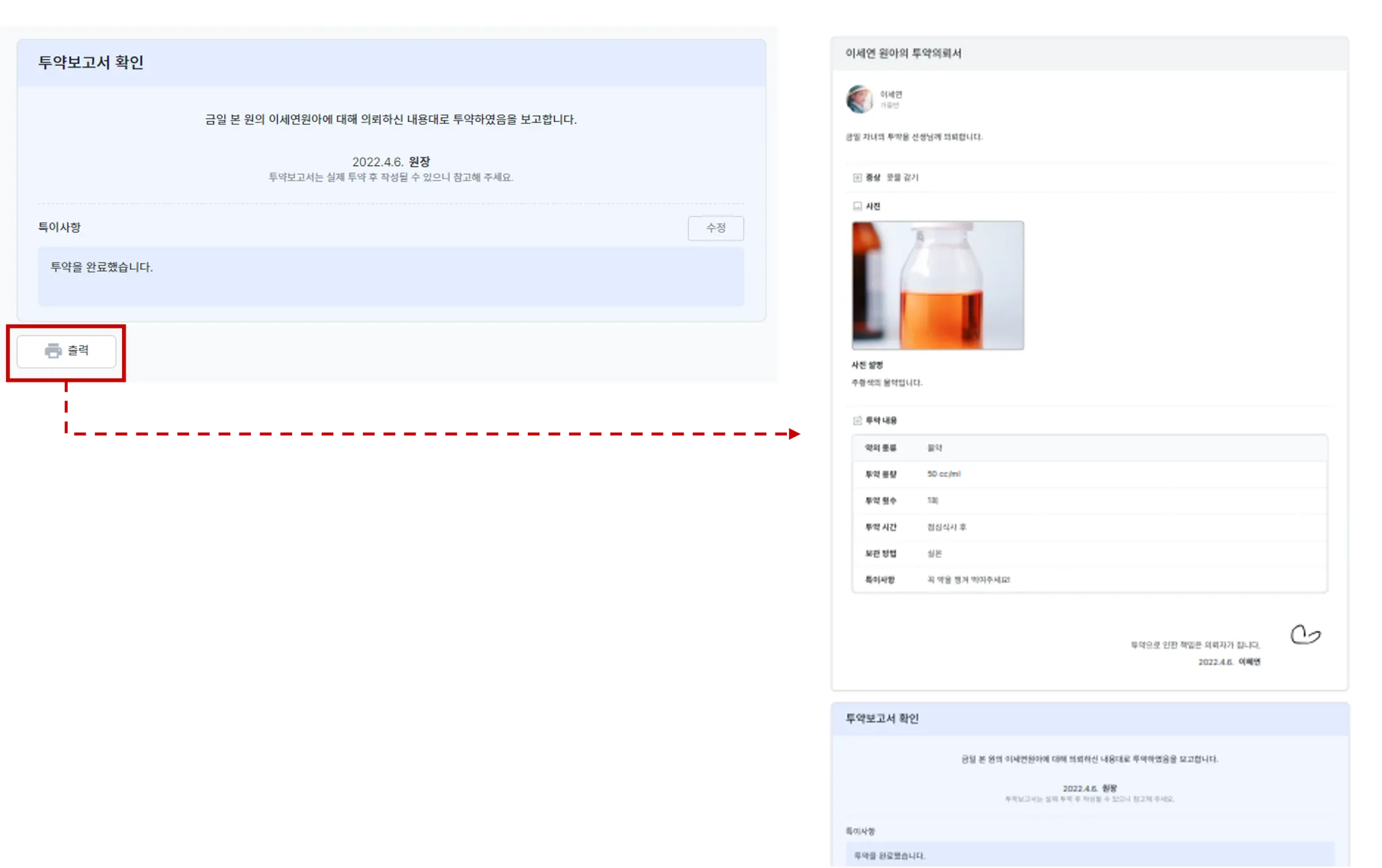 출력 기능을 통해서 투약의뢰서와 투약보고서를 바로 출력할 수 있습니다.