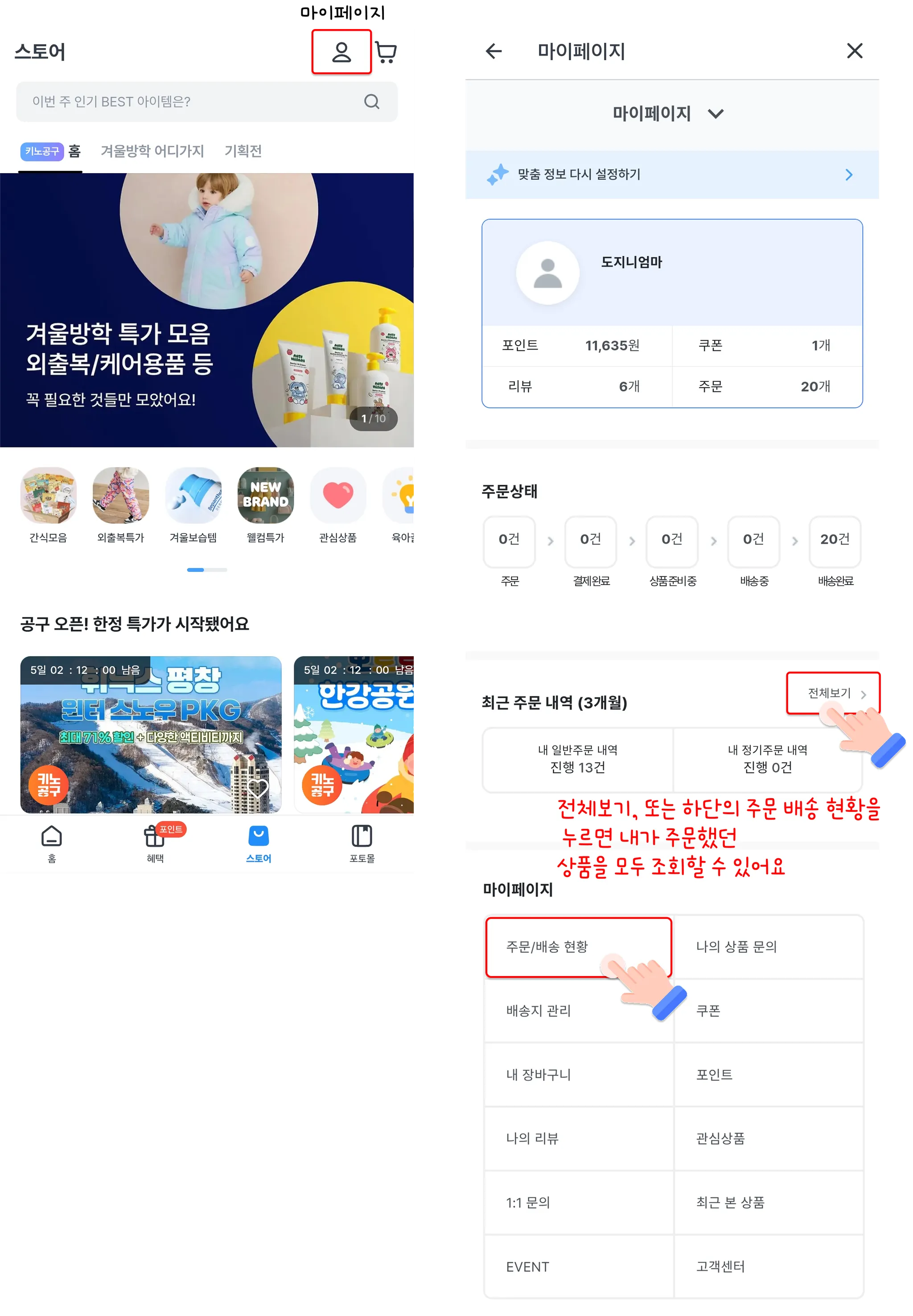 스토어에서 주문한 상품은 마이페이지에서 확인할 수 있어요.
