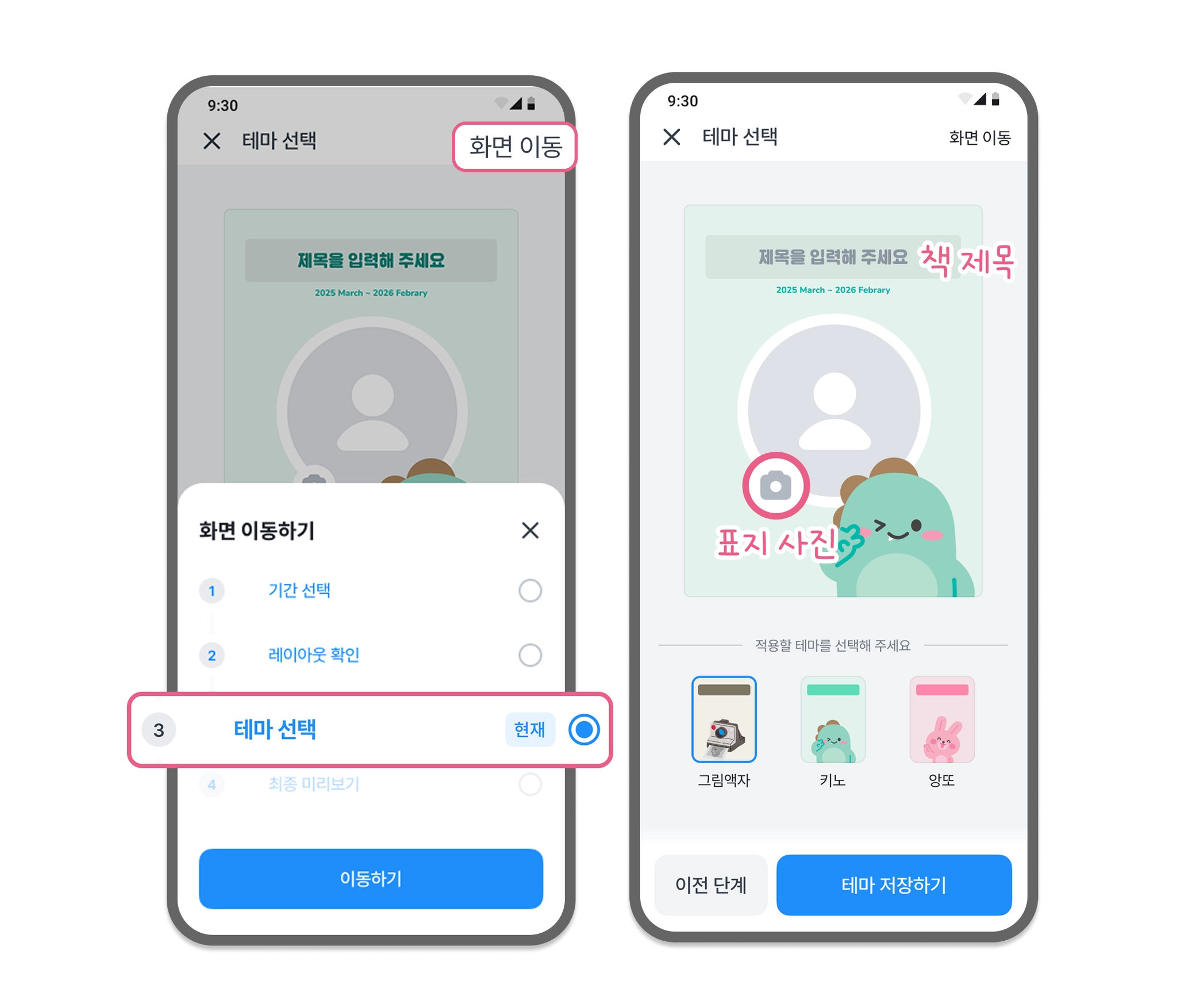 원하는 디자인의 테마와 책 제목, 표지 사진을 설정하세요.