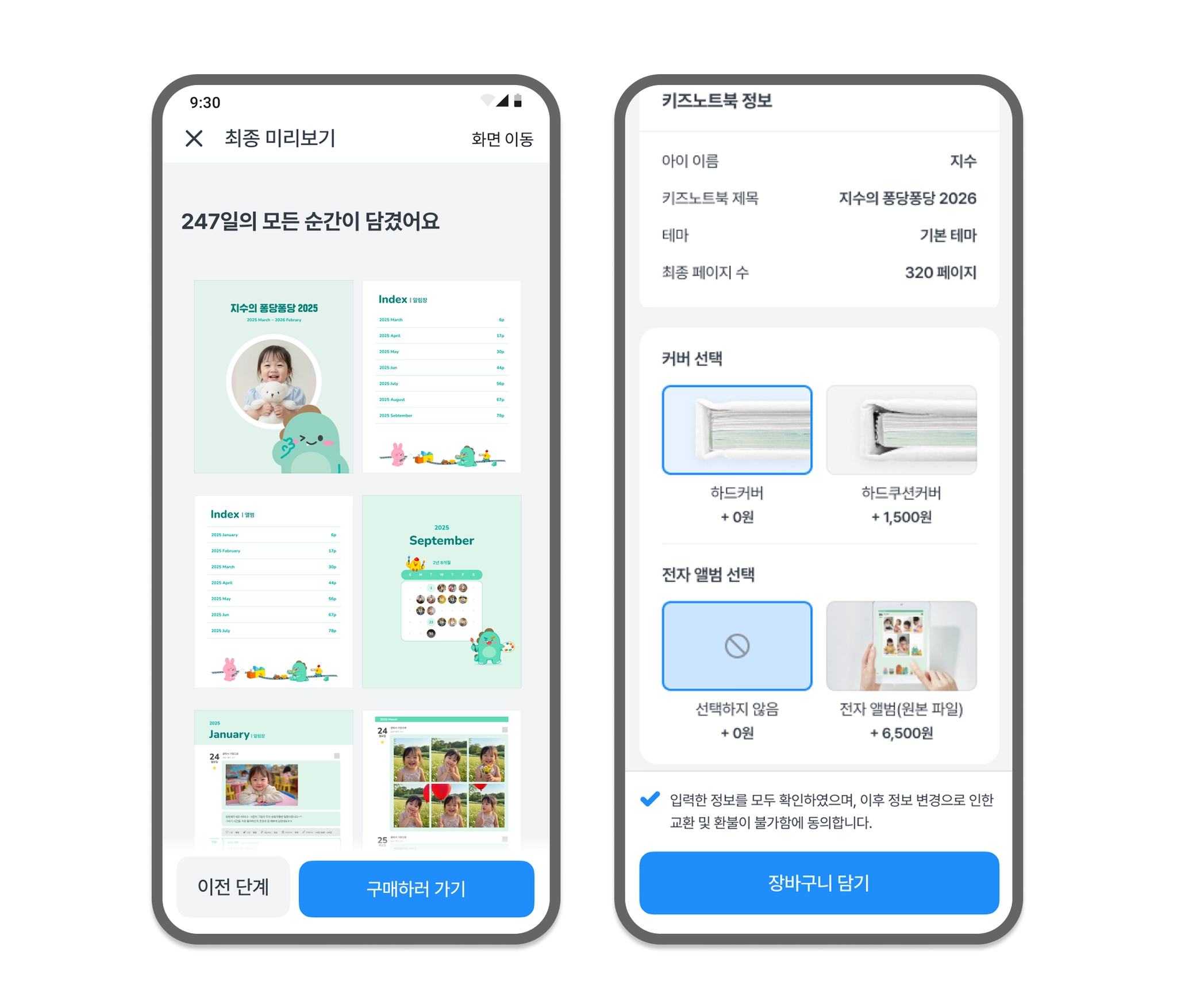 편집이 끝났다면 이제 주문 단계에서 추가 옵션(커버 재질, 전자앨범 포함 여부)을 선택하고 포토북을 결제합니다.