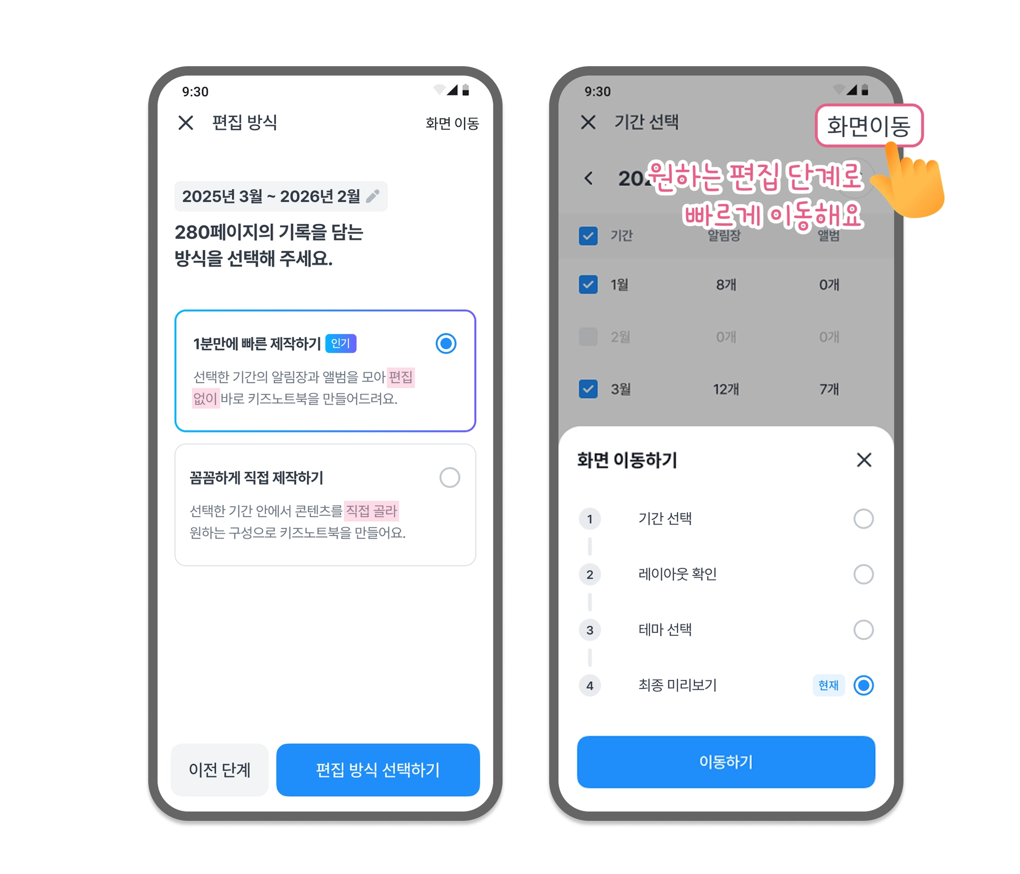 기간 선택 단계에서 제작 기간을 선택하고, 예상 페이지 수를 확인하세요.