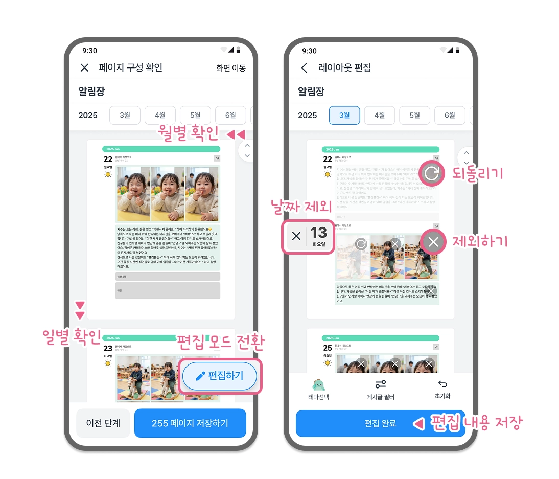 알림장 챕터의 마지막 날짜 이후에, 앨범 챕터의 첫 날짜가 시작되는 점을 참고해 주세요.