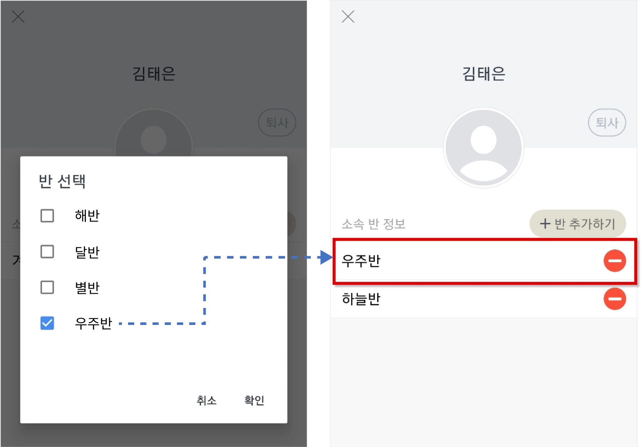 새로 등록할 반 선택 후, 확인버튼을 누르면 새로운 반이 등록됩니다.