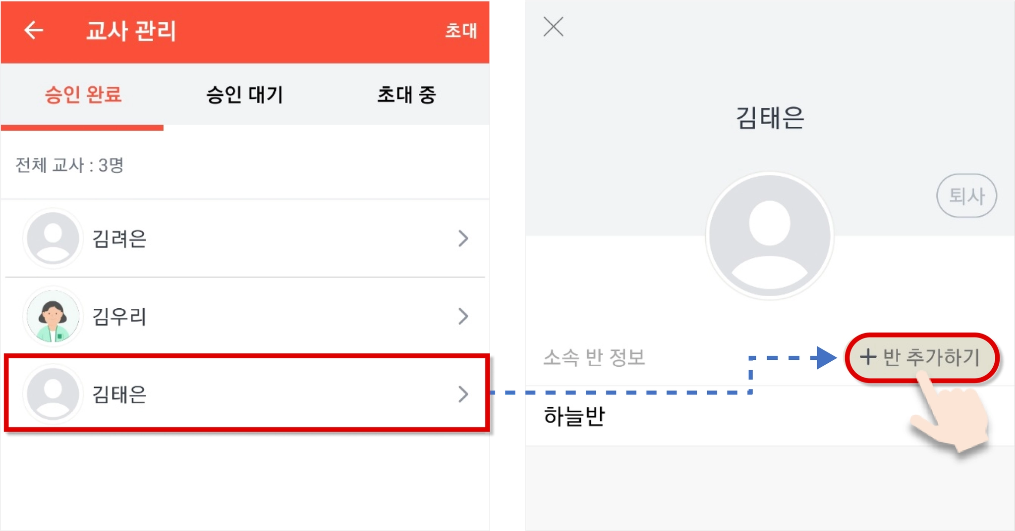 이동할 선생님을 선택한 후, +반 추가하기 버튼을 누릅니다.