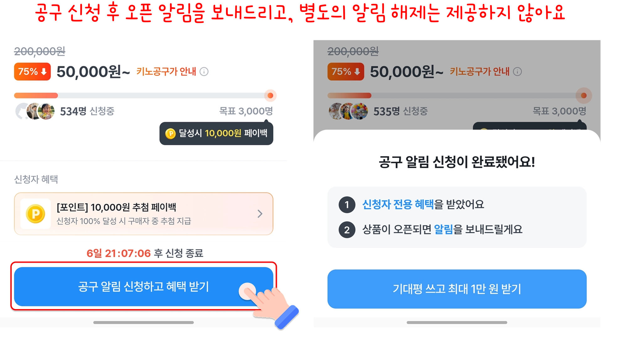 스토어 → 공구 알림 신청 시 오픈 시점에 알림을 보내드려요.