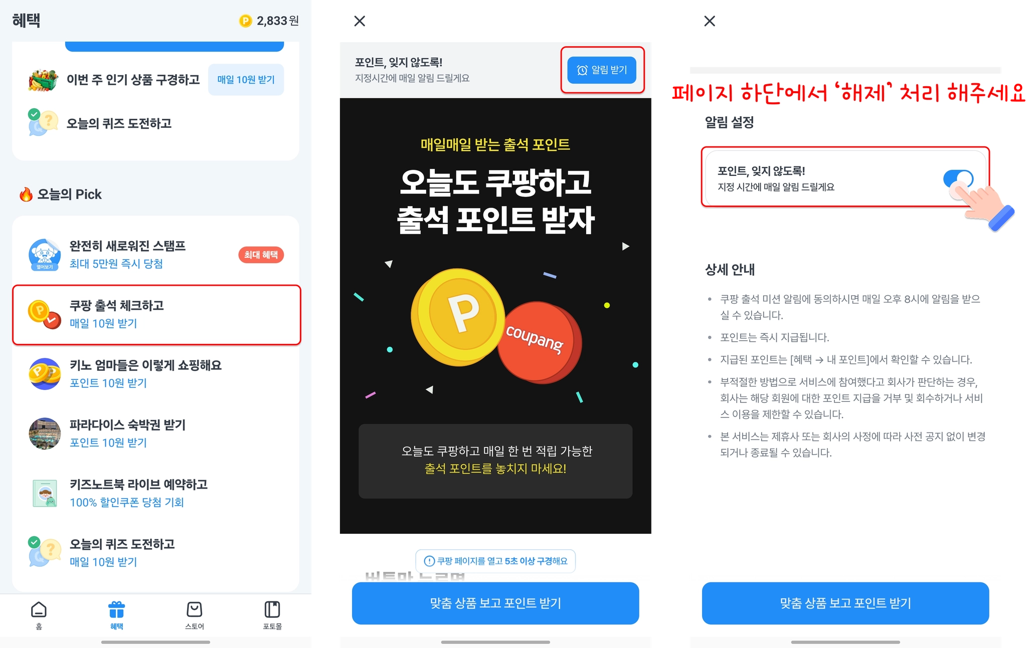 쿠팡 출석 미션 알림 해제