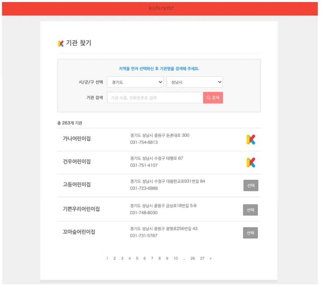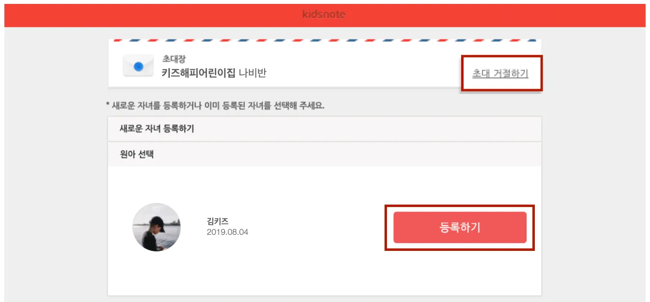원에서 보낸 초대장을 통해 자녀를 등록할 수 있습니다. 초대장을 받지 못했다면 직접 원을 선택하고 자녀를 등록할 수 있습니다.