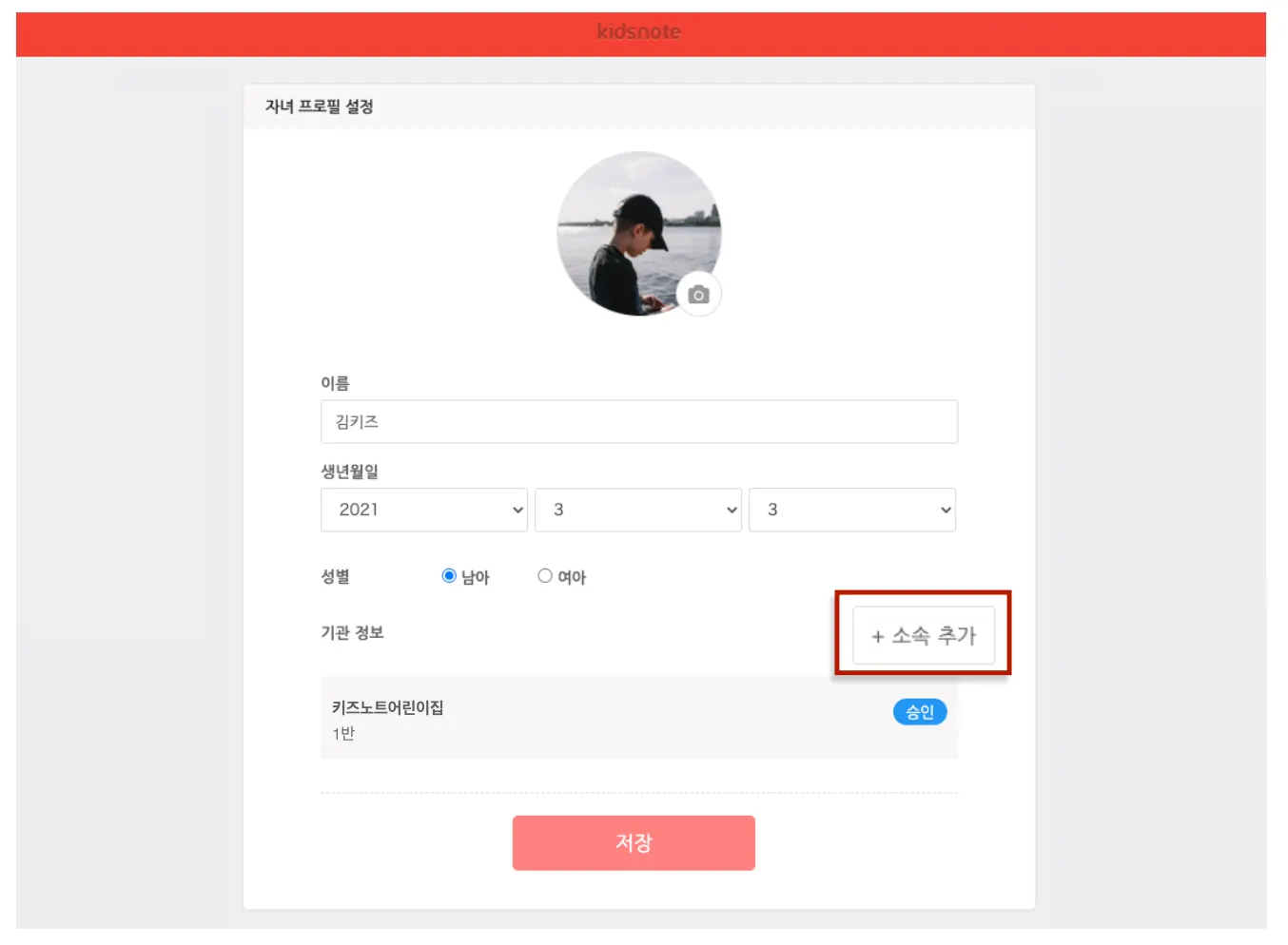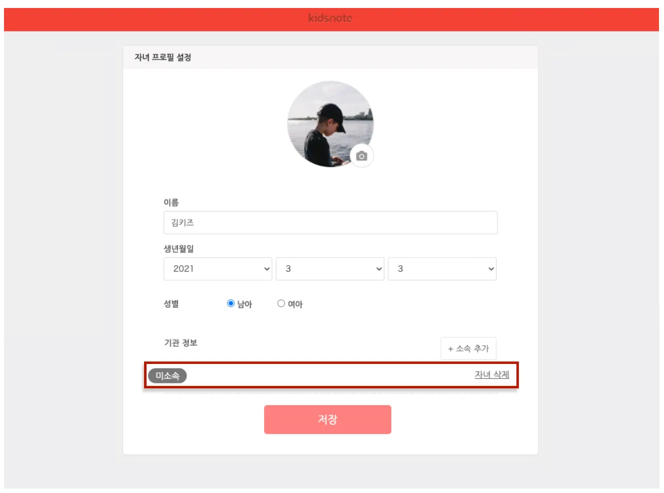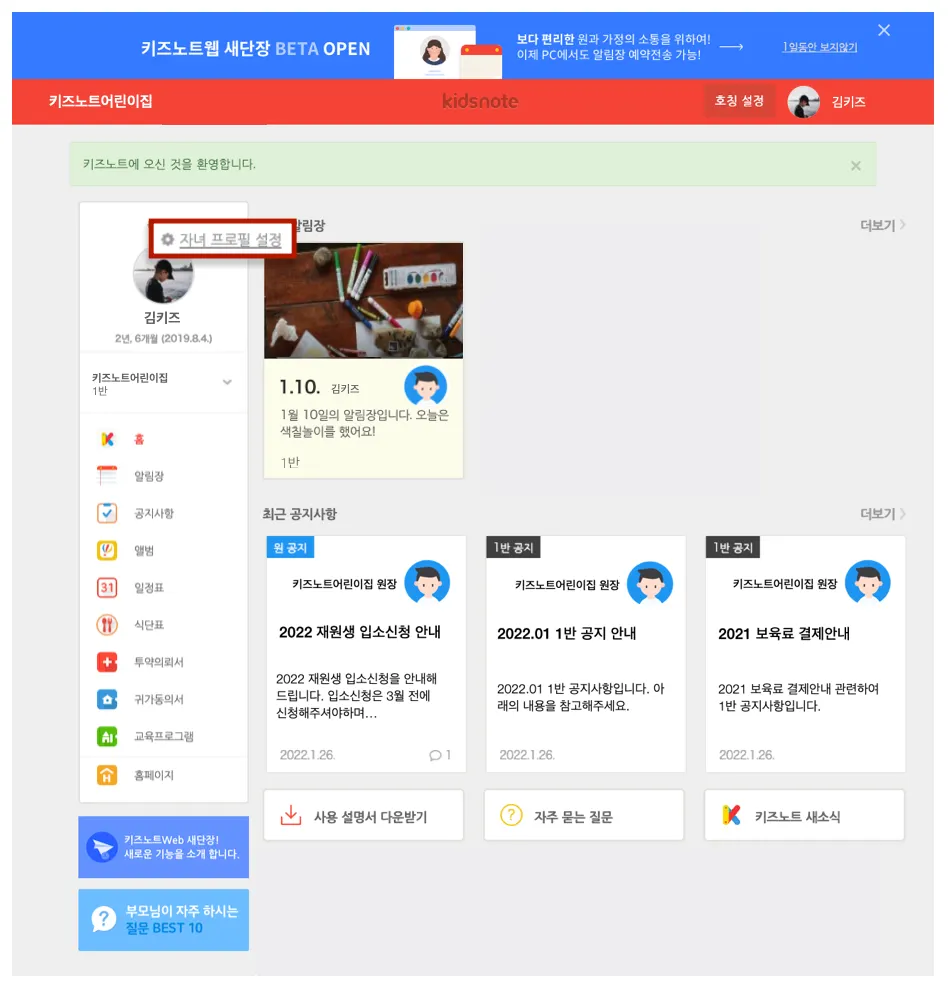 키즈노트 웹사이트에 로그인 후, 좌측 자녀 프로필 설정을 선택해 주세요.