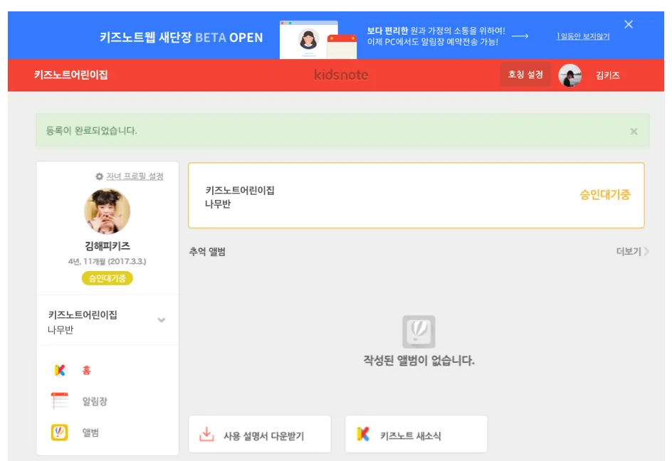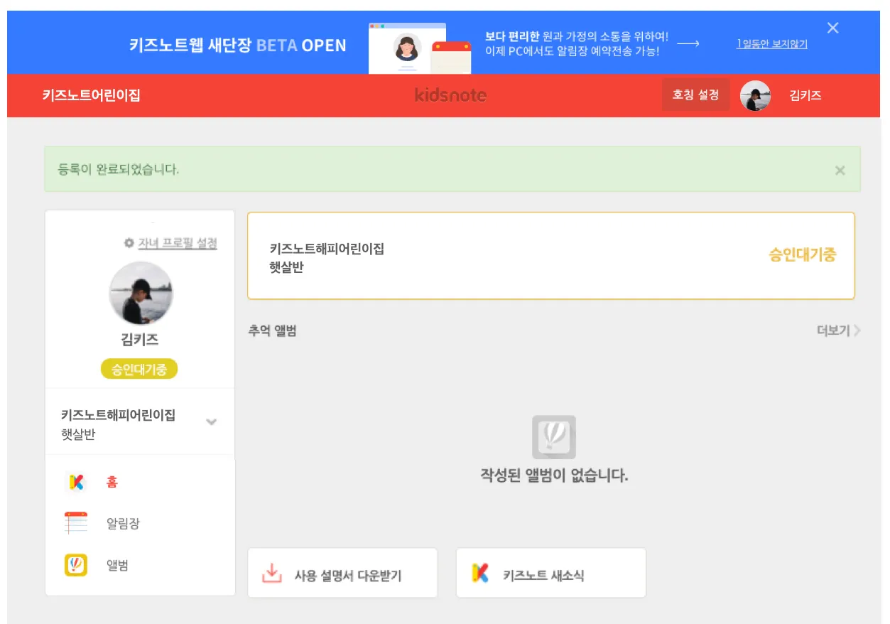 초대로 가입하지 않았기 때문에 승인대기중 표시와 함께 아직 해당 원에서 키즈노트 사용이 되지 않습니다. 원에서 승인을 기다려주세요.
