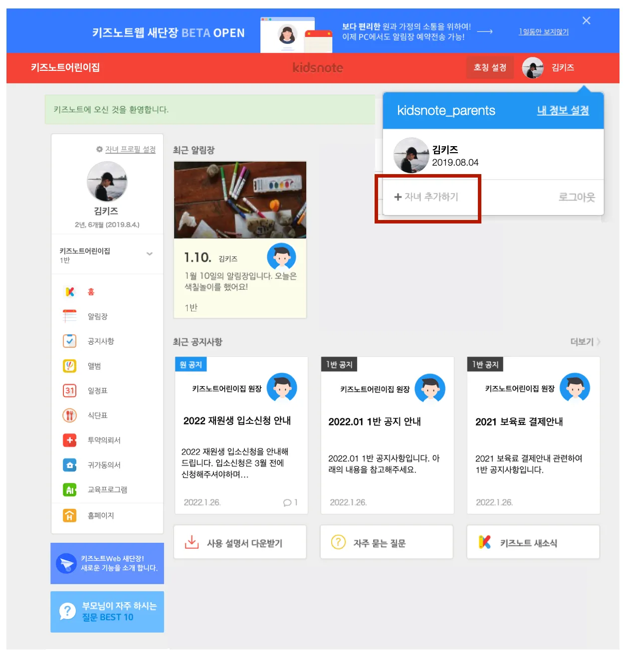 키즈노트 웹사이트에 로그인 후, 우측 사용자 이름 클릭 > 자녀 추가하기를 선택해 주세요.