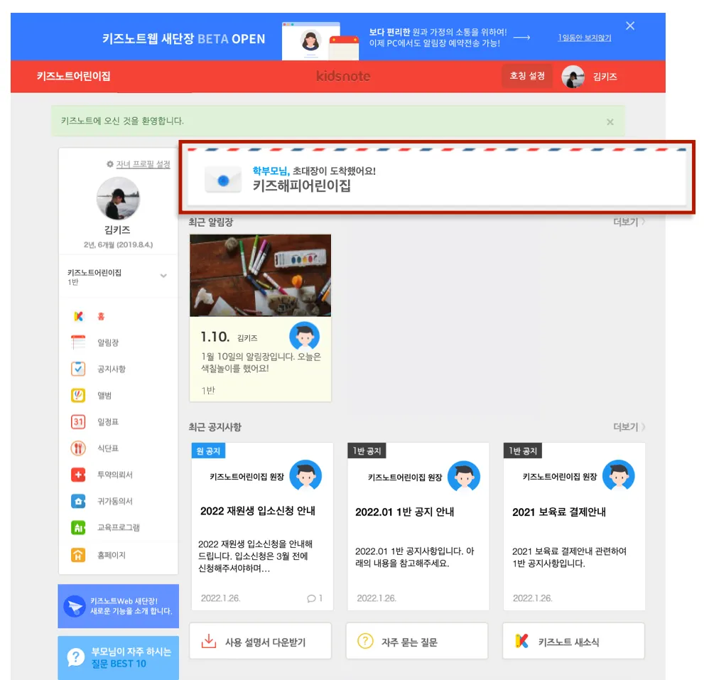 키즈노트 웹사이트에 로그인 후, 새로 받은 초대장을 선택해 주세요.