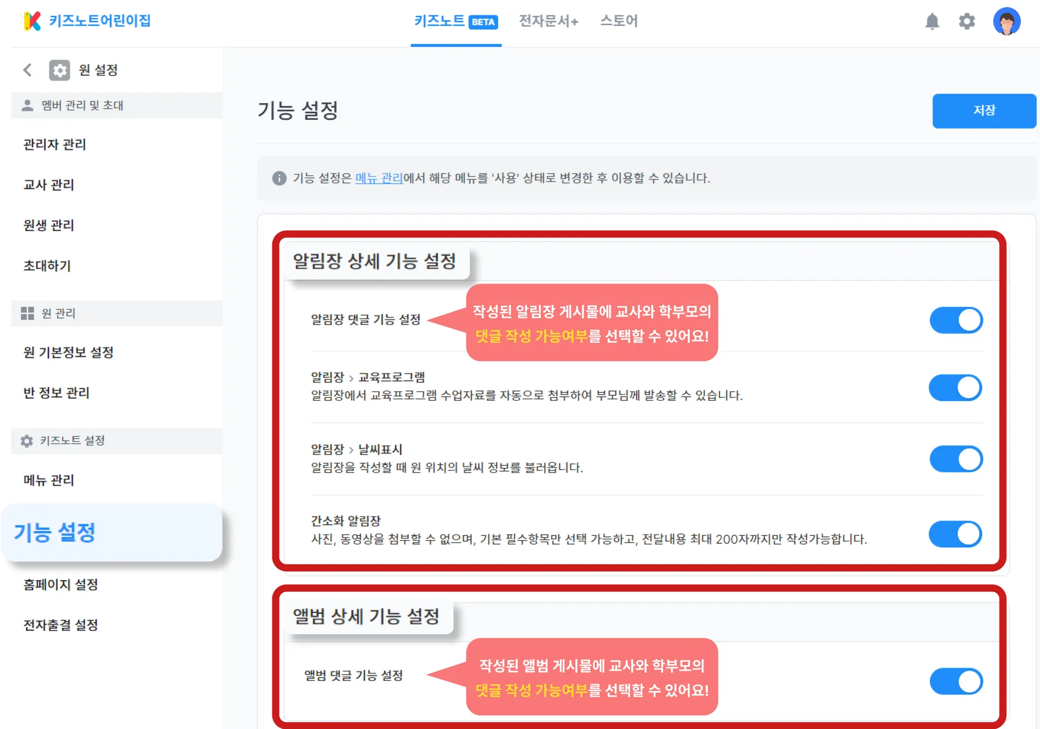 기능 설정에서는 알림장과 앨범의 상세 기능을 설정할 수 있습니다.
