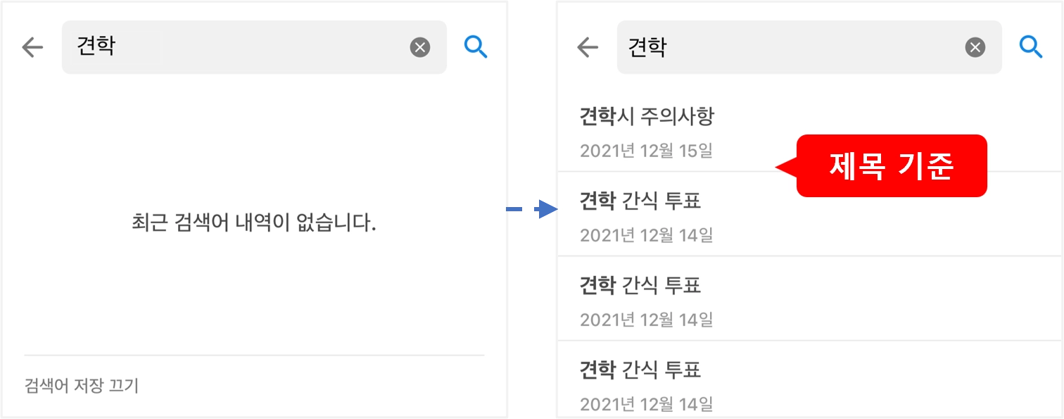 - 만약 ‘견학’ 단어를 검색하셨다면 제목에 ‘견학’이 입력된 공지 글만 보여지고 내용에만 ‘견학’단어가 입력되어 있다면 검색 결과로 조회되지 않습니다. .
