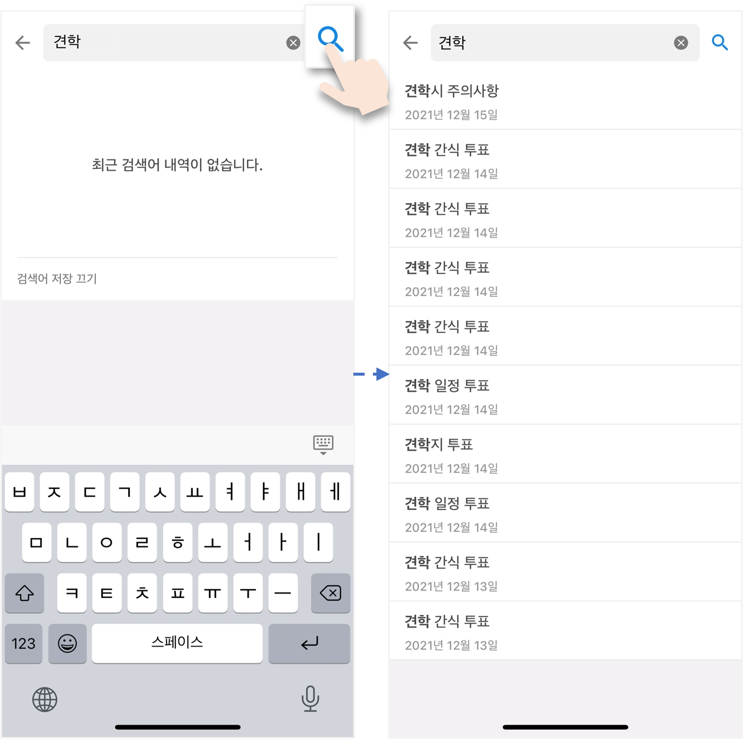 - 돋보기 아이콘 선택 시 검색 화면으로 이동합니다.