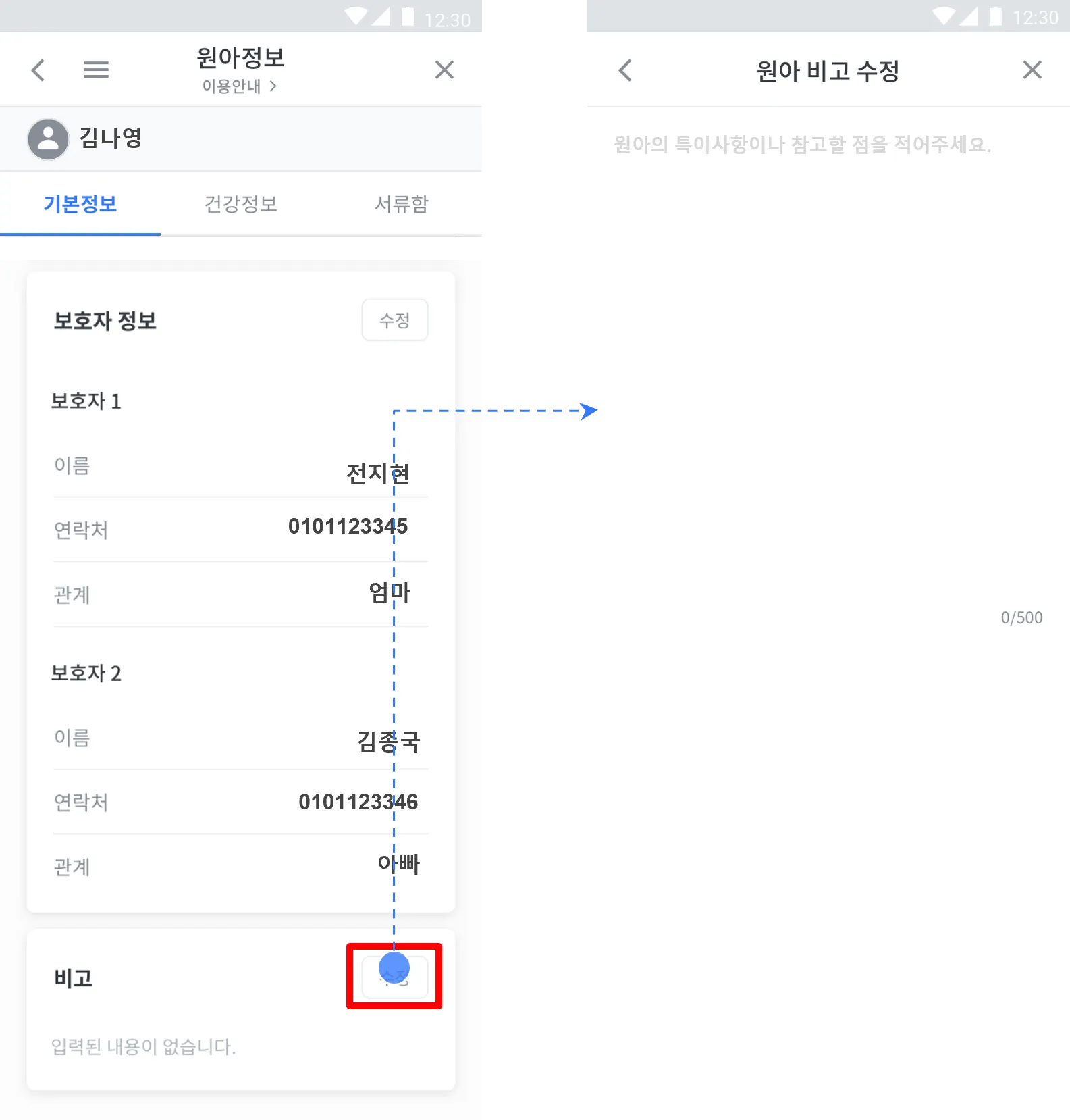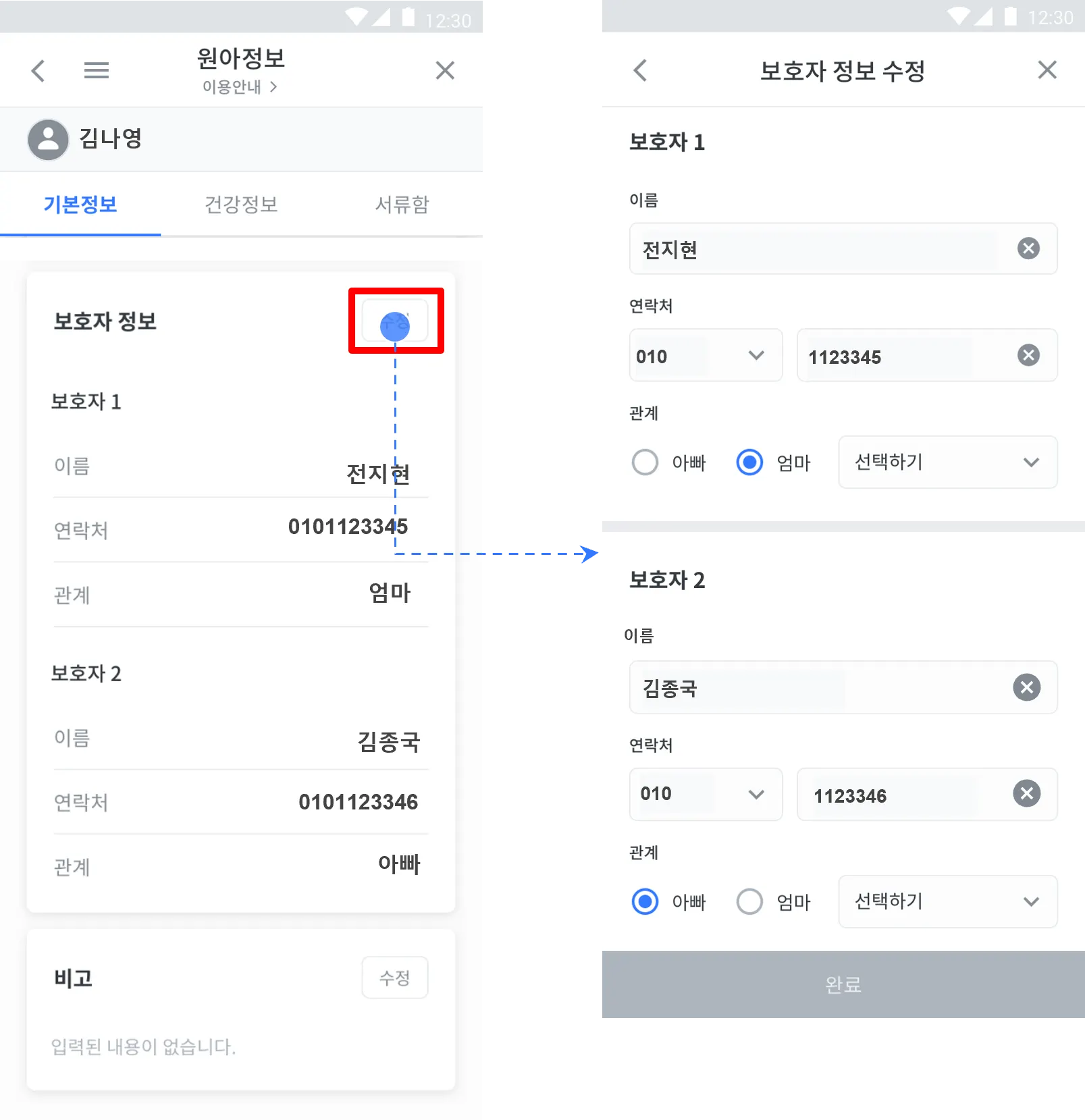 원아 보호자 정보 수정 : 보호자 정보 섹션의 수정 버튼을 선택하고, 내용 수정 후 완료 버튼을 선택하세요.